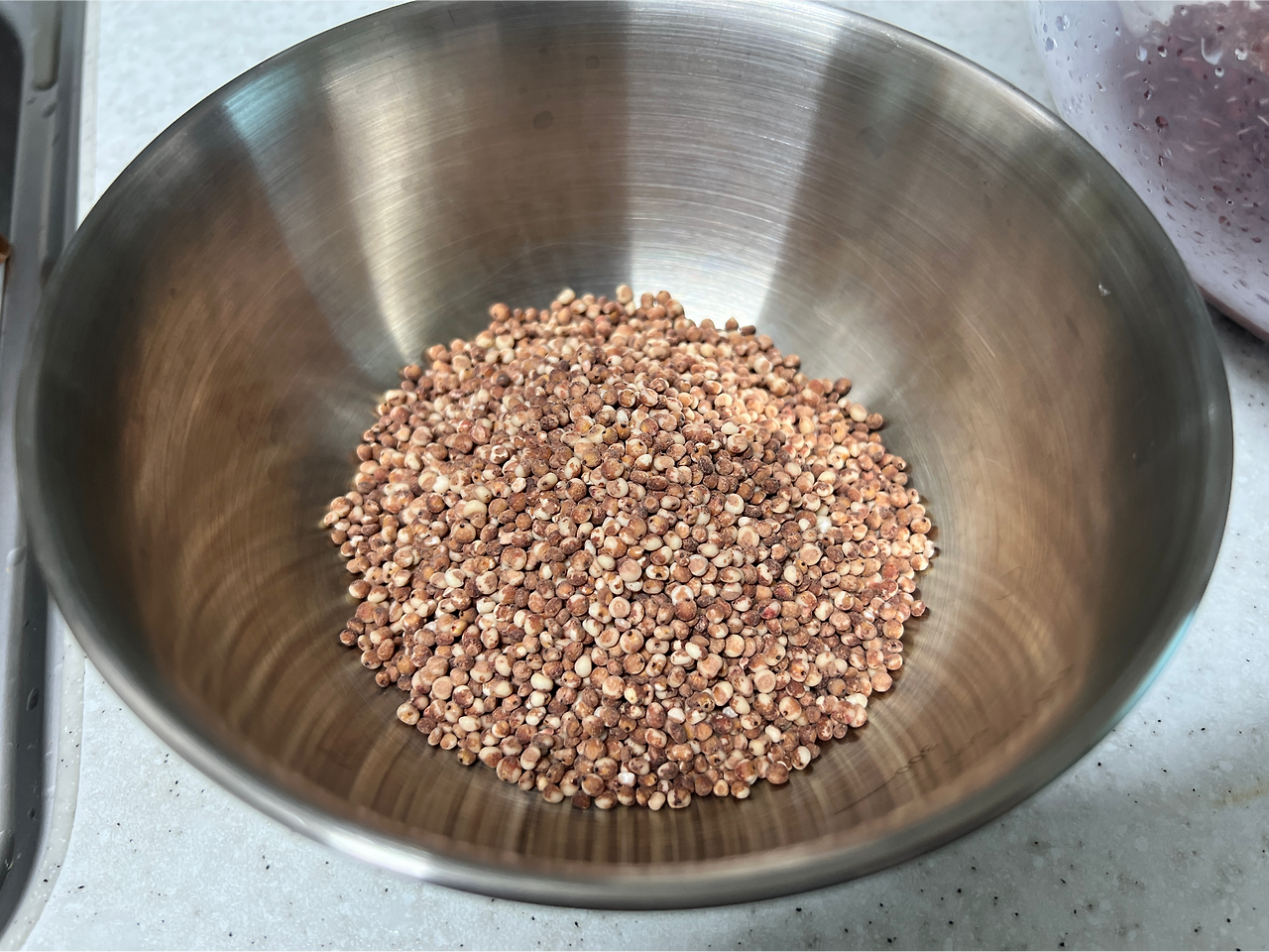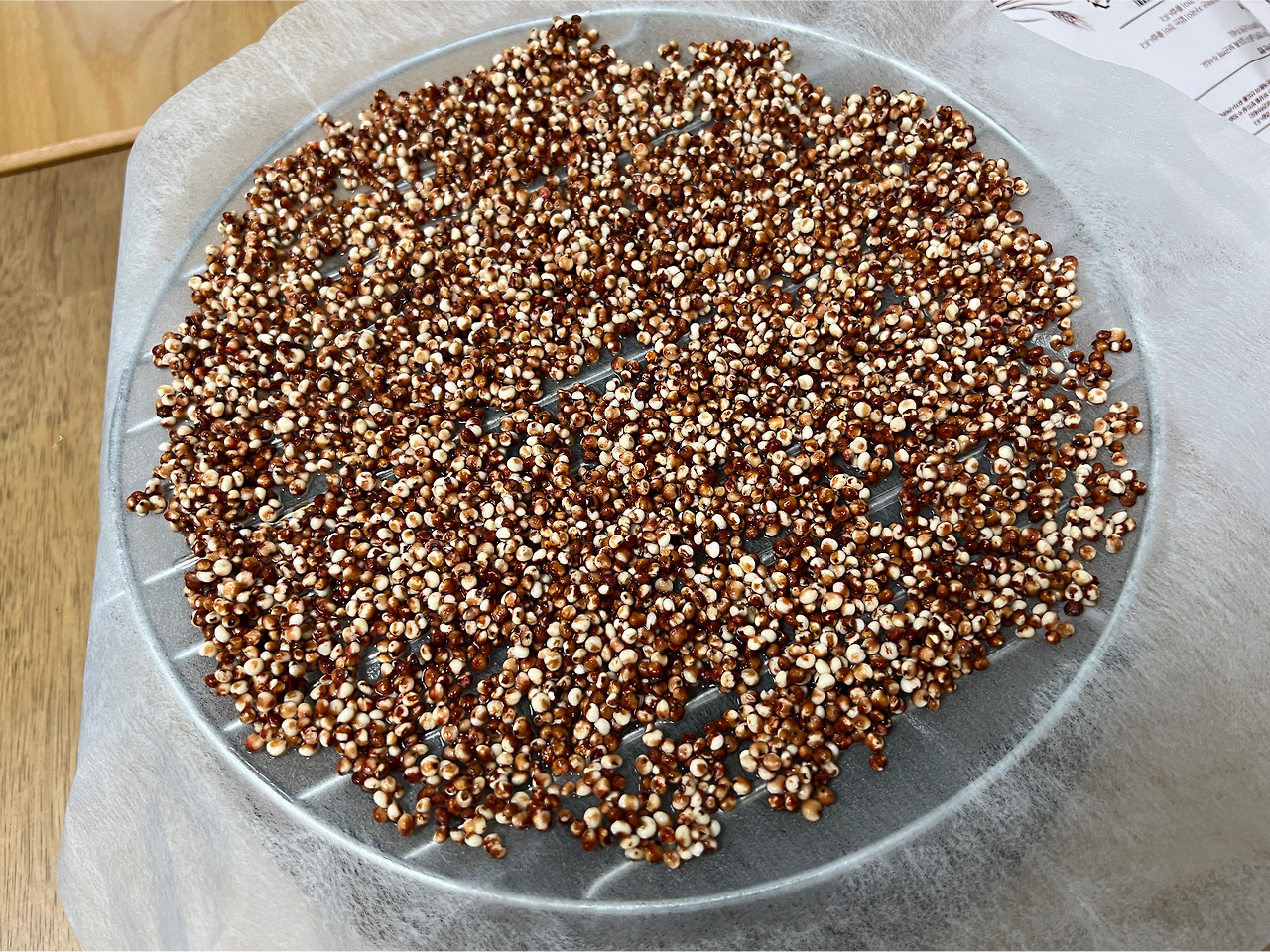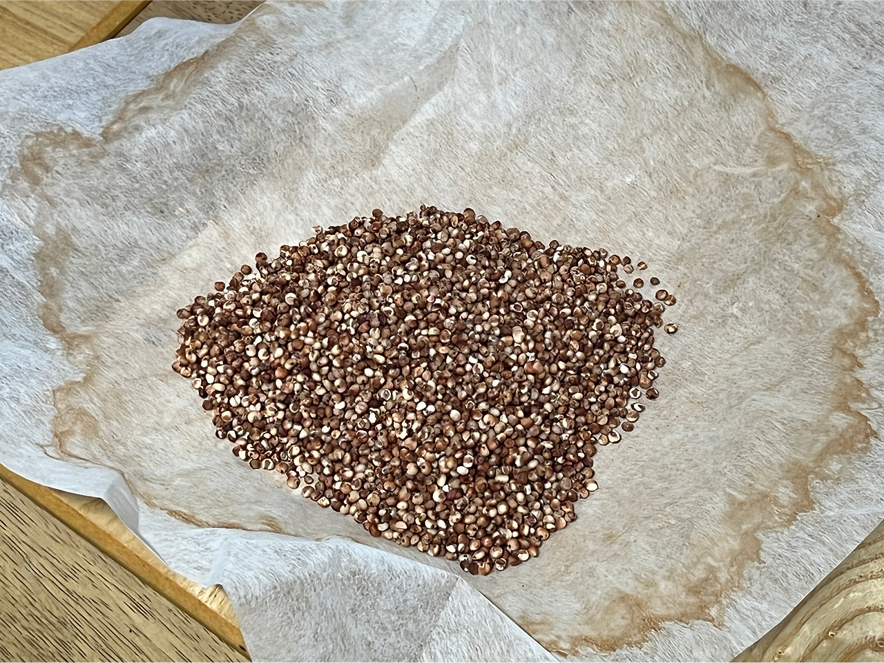 그럼 고민을 할 것도 없지. 검색을 해보니 다른 주부님께서 무려, 수수를 직접 가루를 냈다고 하니. 나도 따라해보기로 했다. 먼저 수수를 잘 씻어서 오븐에서 건조하기로. 아 그런데 수수가 붉은 곡물이긴 한지 물에 붉은색이 물씬 배어난다. 신기하네.