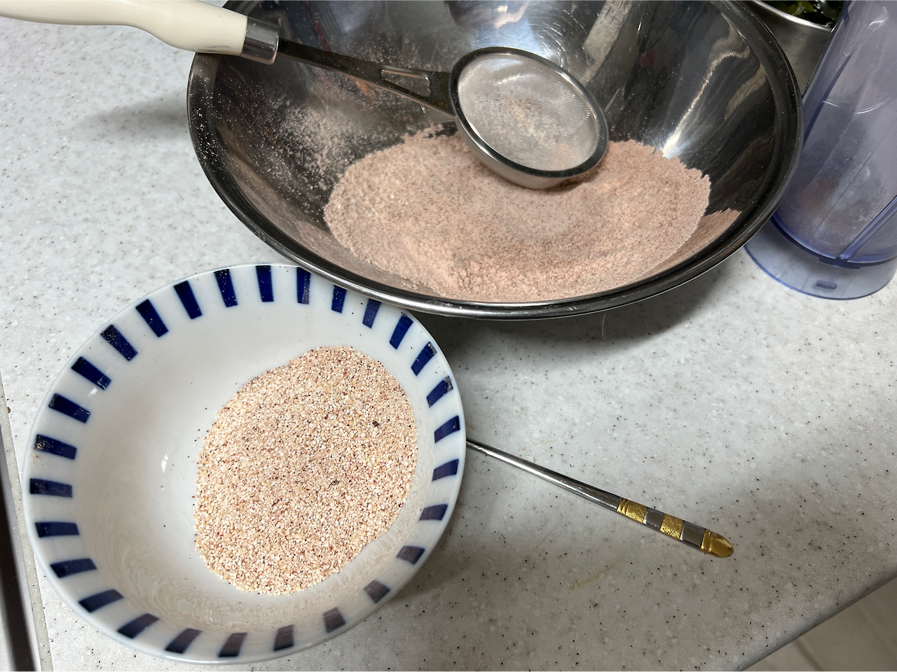오븐에서 70도에 무려 4시간을 수수를 말렸다. 그때쯤이 되니 가루를 만들어놓을 수 있을 정도는 되었다. 이제 이걸 가루를 내야 한다는 건데 사실, 수수를 직접 가루를 낸다는 아이디어를 내가 막힘없이 따르기로 한 것이, 나는 매일 콩을 갈아서 가루를 만들어서 먹는 사람이잖아? 그럼 어려울 것도 없지. 간단하다. 갈고, 채에 거르고, 또 갈고, 거른다.