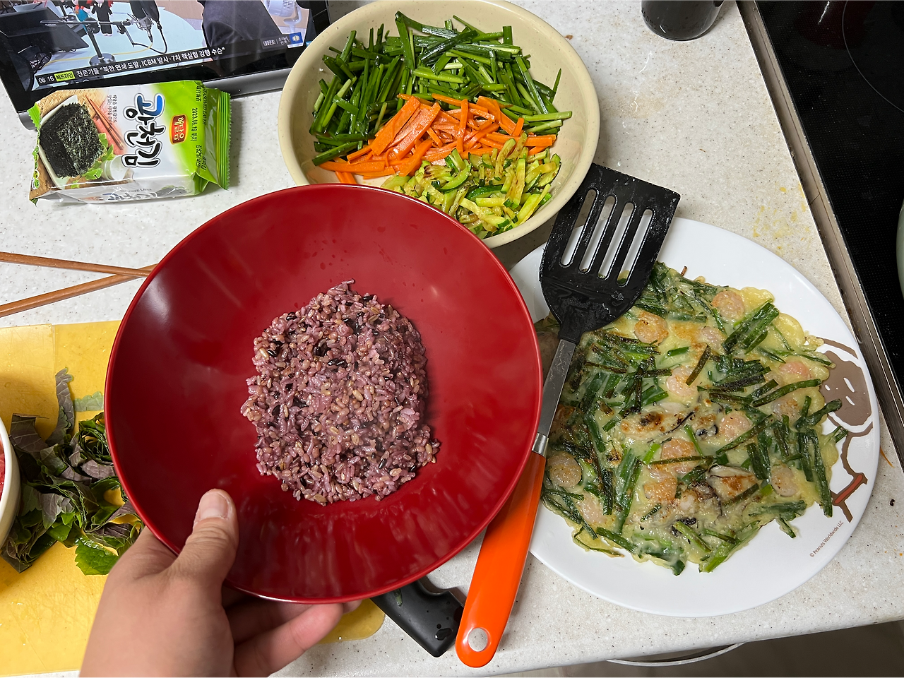 그리고 계란 노른자를...올려야 하는데 어? 마침, 두번째 부추전이 팬에 올라가 있다. 나는 냉장고에서 계란 두 알을 꺼내서 부추전에 탁탁 올린다. 그리고 숟가락으로 노른자만 떠내, 비빔밥에 올린다. 부추전 땡큐다. 파전에 계란을 두르듯, 나는 남은 흰자를 잘 둘러 부추전을 뒤집엇다. 식사 준비는 이대로 다 되었다.