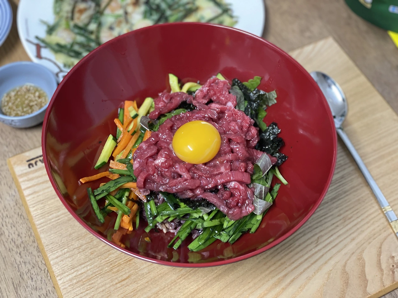 육회비빔밥은 만족도에 비하여 수고가 크지 않다. 늘 하는 말이지만 육회랄 게 별다른 비법이 있는 요리는 아니다. 다만 신선한 쇠고기를 얼마나 합리적인 가격에 제공할 수 있느냐 하는 문제. 마트에서 파는 육횟거리가 얼마나 맛이 있고 신선하겠느냐만, 그런 문제 역시 비빔밥으로 가려버리면 해결. 그 잘나간다는 광장시장 육회집들도 대단한 비법이 있는 게 아니라 싸게 먹을 수 있다는 게 가장 큰 메리트다. 그런고로 육회는, 신선한 걸 저렴하게만 먹을 수 있다면 맛에는 고민을 크게 하지 않아도 별 문제가 없다. 쇠고기란 게 그렇지.