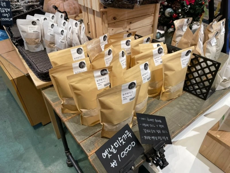 들기름이 있다. 중국산 들기름도 있고 챔기름도 있고 생들기름도 있다. 깨를 가져오면 직접 깨를 볶아서 짜주기도 하는 곳인데 여기선 판매용으로 제법 알찬 구성.
