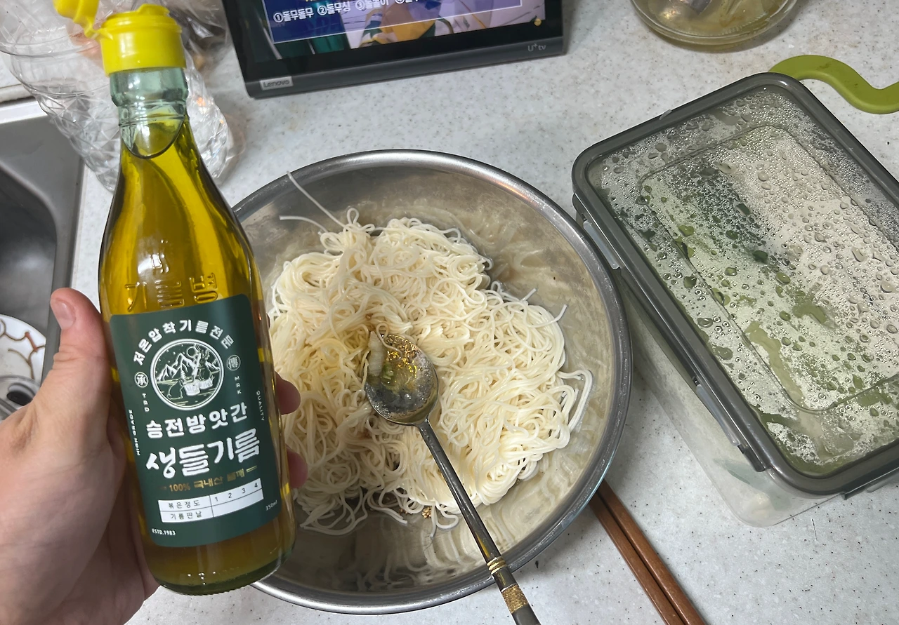 솔직히 다시 한번 말하자면 들기름이 향이 강하거나 진하지 않다. 그리고 더 솔직히 말하면, 아이 때문에 특히 아침 식사는 밥이 코로 들어가는지 귓구멍으로 들어가는지 알기 어려울만큼 정신이 없다. 이날 아침의 국수 맛을 나는 정확히 기억하지 못한다. 기억나는 것은 오로지 굉장히 높은 만족도 뿐. 그럼 왜 이 비싼 들기름까지 사서 부었을까, 하면.