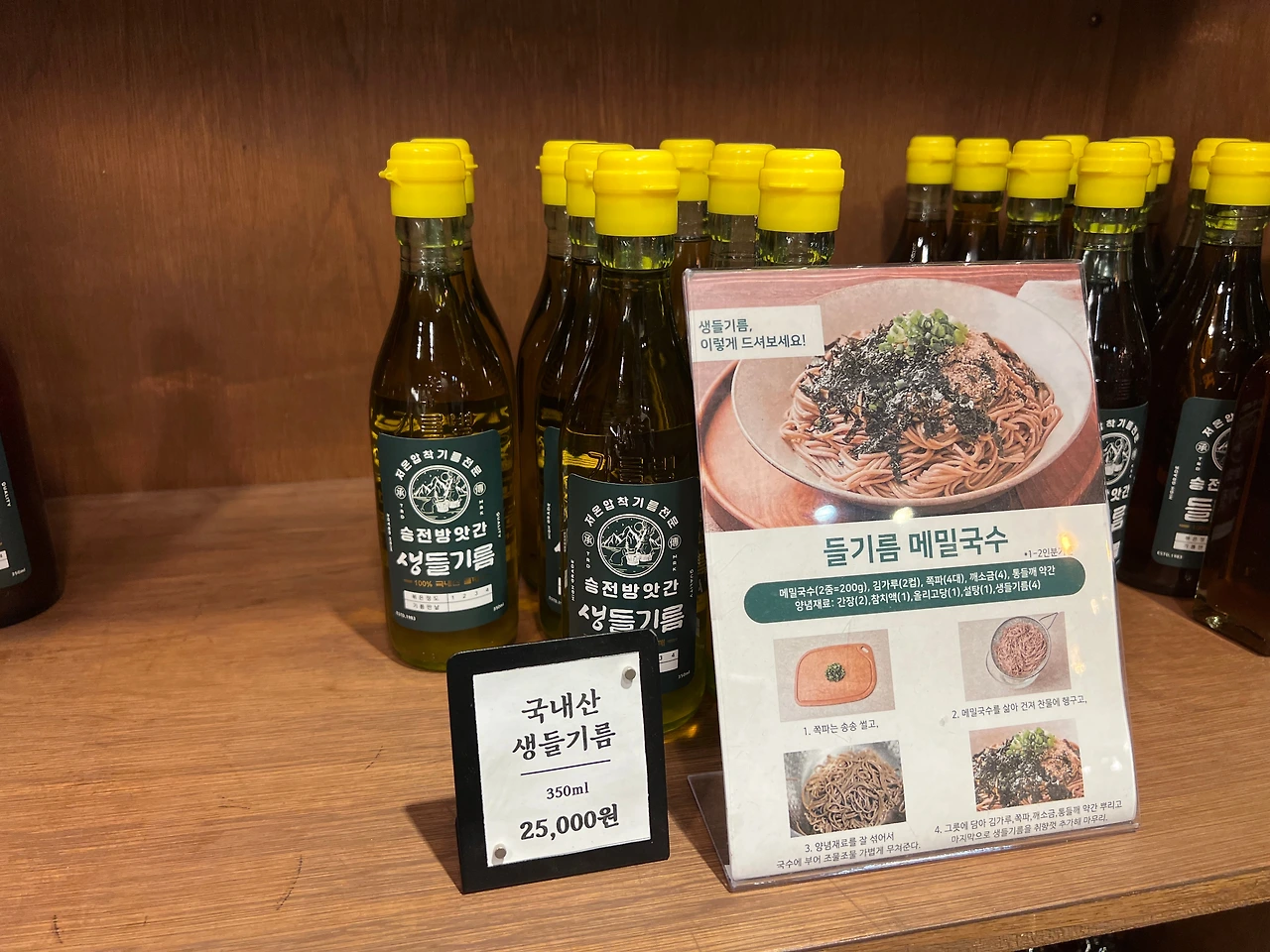 나는 결심했다. 바로 산다. 거금 25,000원을 들기름 막국수에 태우기로 하고, 마치 올리브유처럼 맑고 투명한 국내산 생들기름, 산다! 아 참고로 보통 국내산 들기름은 어지간하면 2만원 정도는 한다. 엄마가 아는 분들께 사오면 값이 달라지겠지만.