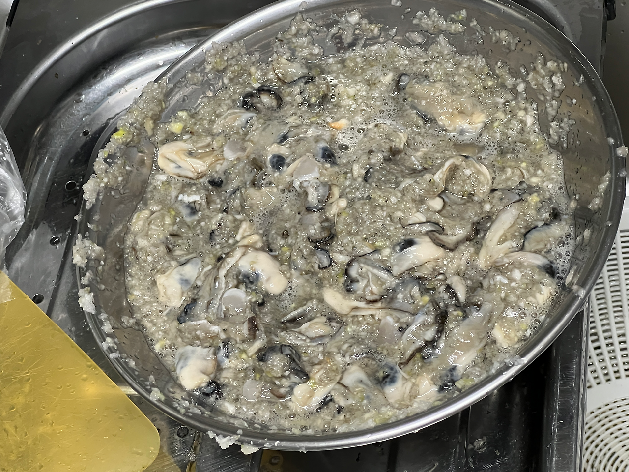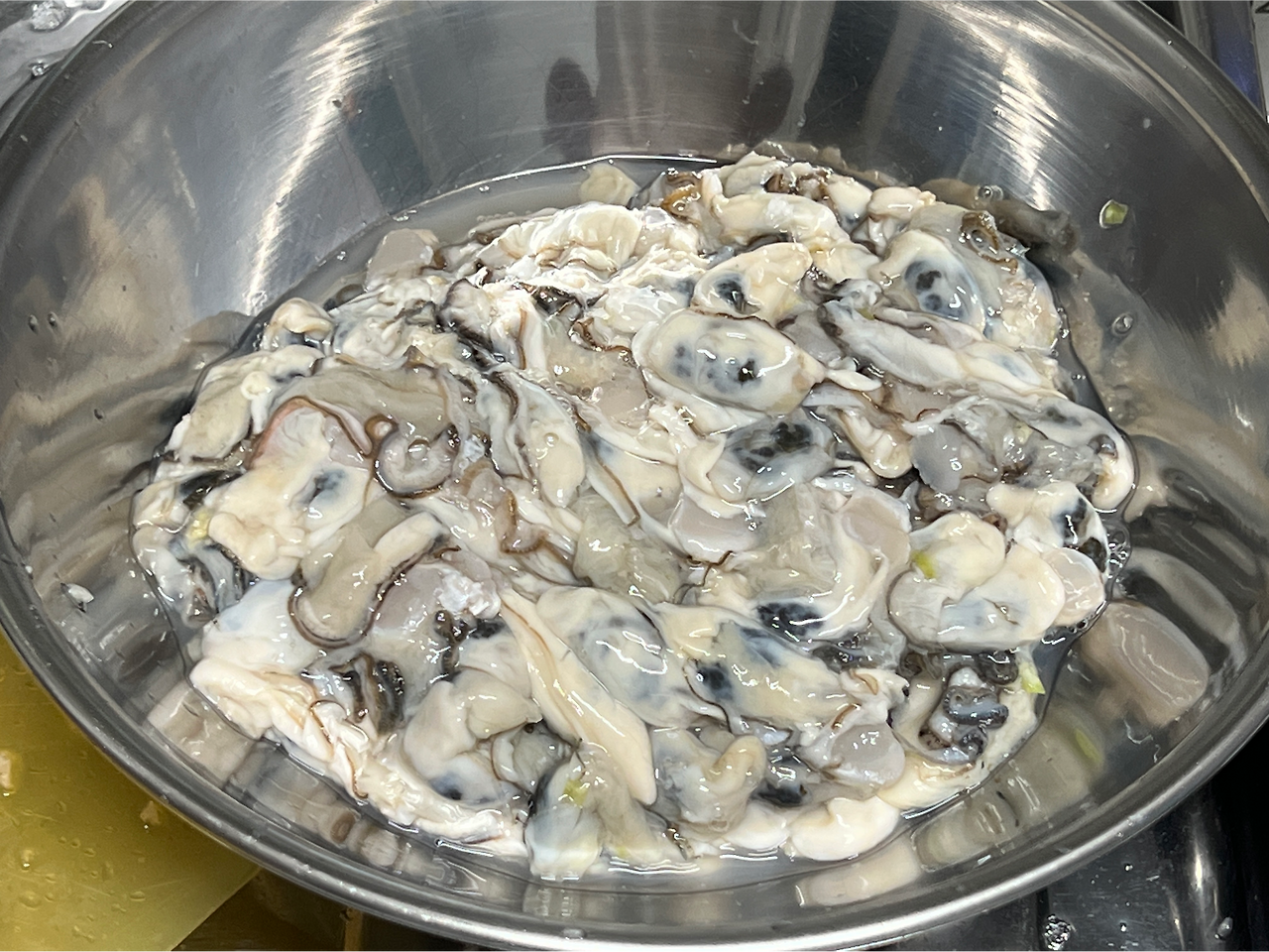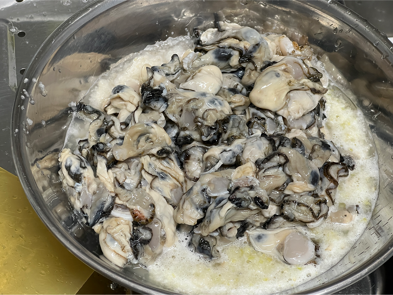 ...오우...효과는 굉장한 것 같다. 느낌일지 모르겠지만 그냥 채반에다가 물로, 맨손으로 벅벅 굴을 닦는 것보단 확실하게 굴이 색이 뽀얗게 되는데, 사실 이건 좀, 간 무의 효과인지는 확실하진 않다. 왜냐면, 간 무를 완전히 털어내기 위해 평소에 굴을 씻는 것보다 훨씬 여러번 번거로운 작업을 거쳐가며 굴을 씻었기 때문이다. 무가 아니어도 그냥 이정도 정성으로 굴을 씻는다면 어차피 하얗게 될 것만 같은 느낌적인 느낌이랄까?