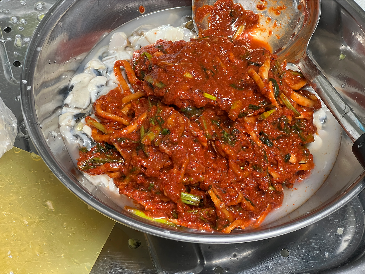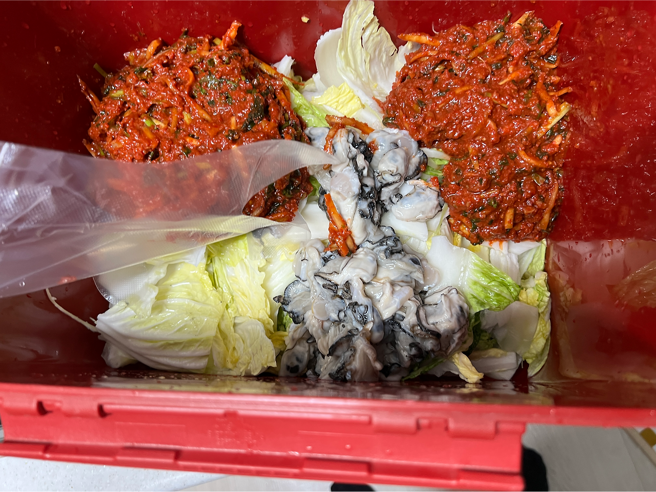 먼저 산 굴 한팩...양 너무 적다...배추 한 포깅에 굴 500그램은 택도 없다...다음날 두팩을 더 샀다...이미 만들어둔 겉절이에 굴을 더 넣는 거니까 추가하는 굴엔...김치속을 따로 먼저 버무려서 합친다...