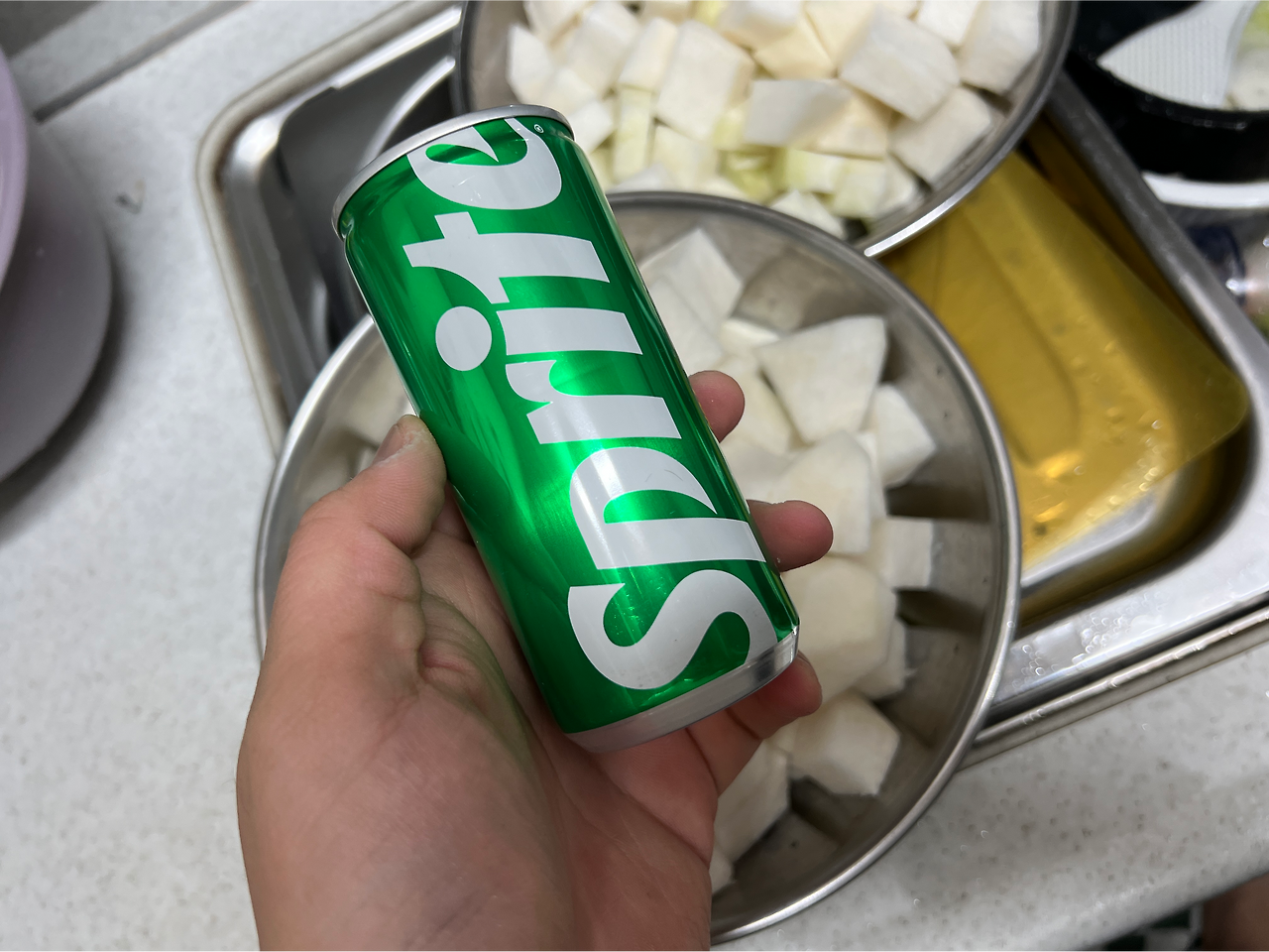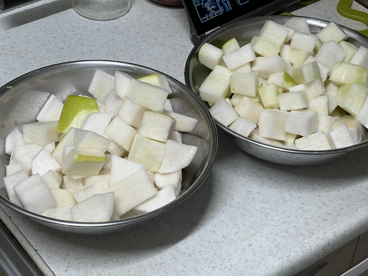 하여 겸사겸사 사이다로 무를 갈았다.무 하나에 소금 두 큰술, 사이다 150ml정도. 그래서 여러번 뒤집어준 뒤에 30분 정도 두었다. 탄산으로 무 절이면 무가 아주 물러질 수 있어서, 되도록 짧게 절이고 빨리 먹으라 하네? 뭐어 무 두개 정도 깍두기면 일주일도 안 걸릴 양이긴 하다.
