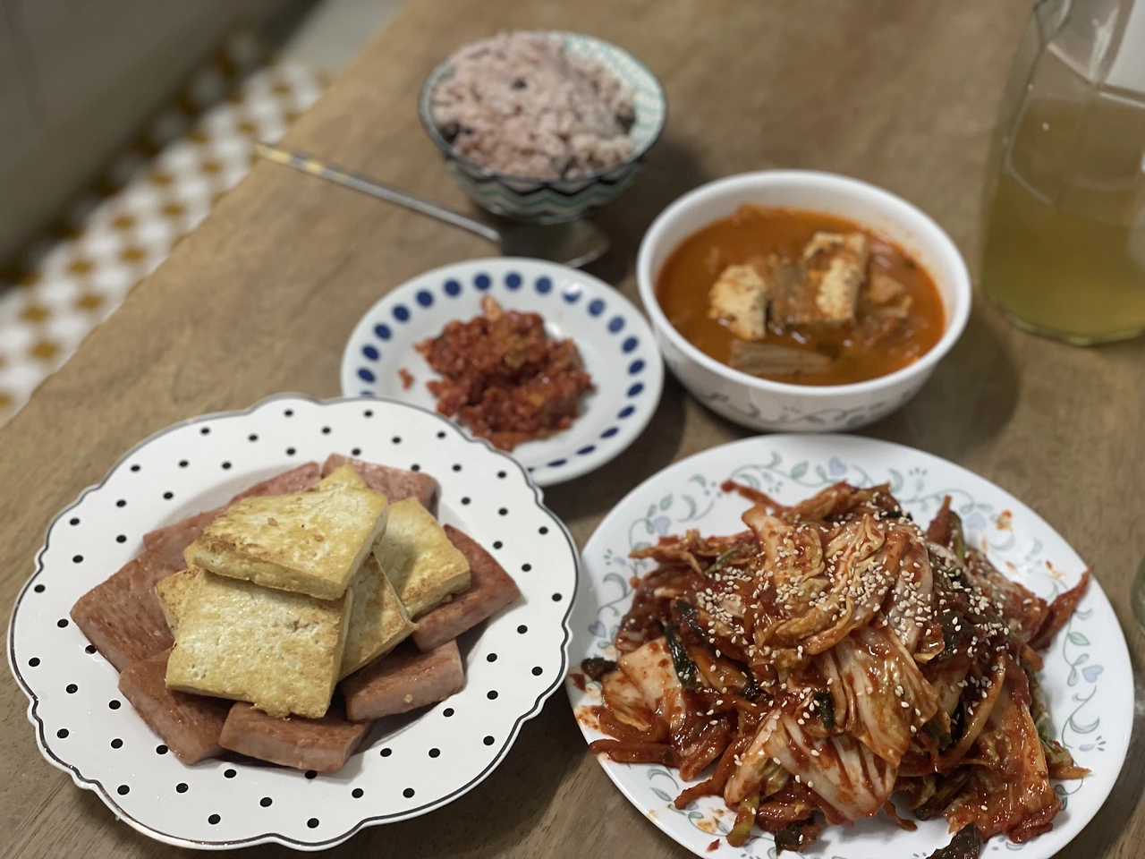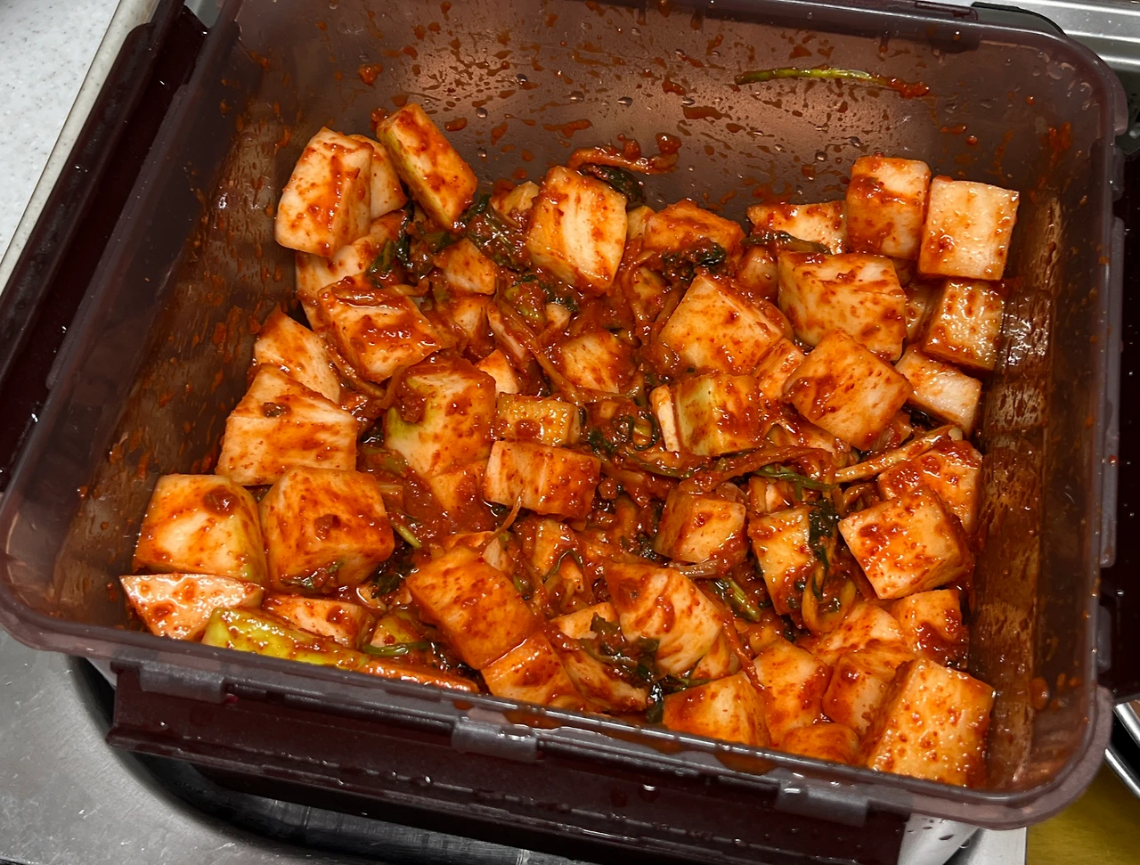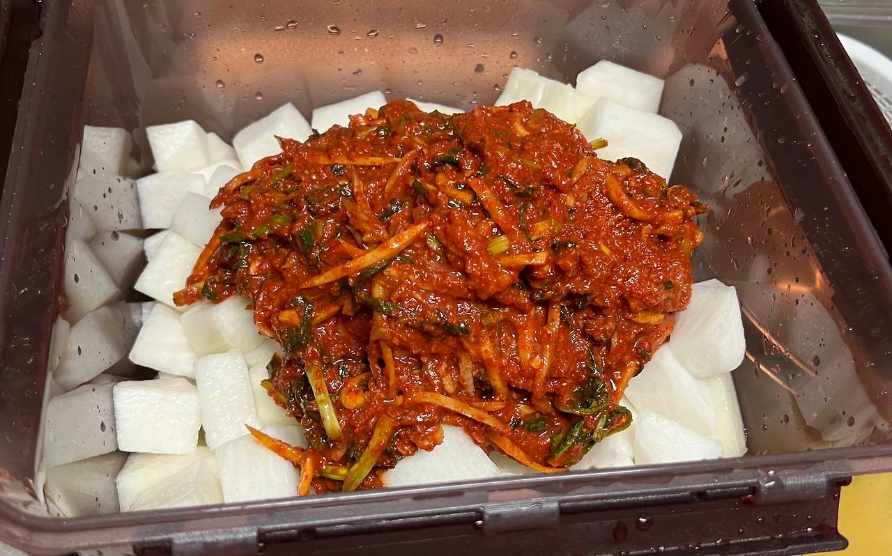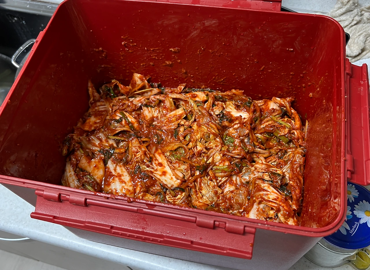 그래서 완성. 와. 순식간에 김치 부자다. 동치미, 깍두기, 새 김치와 묵은 김치, 거기에 굴김치까지, 집에 갑자기 김치 폭풍이 불어오는데? 근데 김치속이 1000ml 정도 분량은 남았다. 엄마에게 경과 보고도 할 겸, 김치들 사진과 함께 "내일 쪽파나 사다가 남은 김치속 처리할라구."라고 엄마에게 보내니, 엄마는 얼마 뒤 "잘하고 있네" 라고 짧은 칭찬을 남겼다.