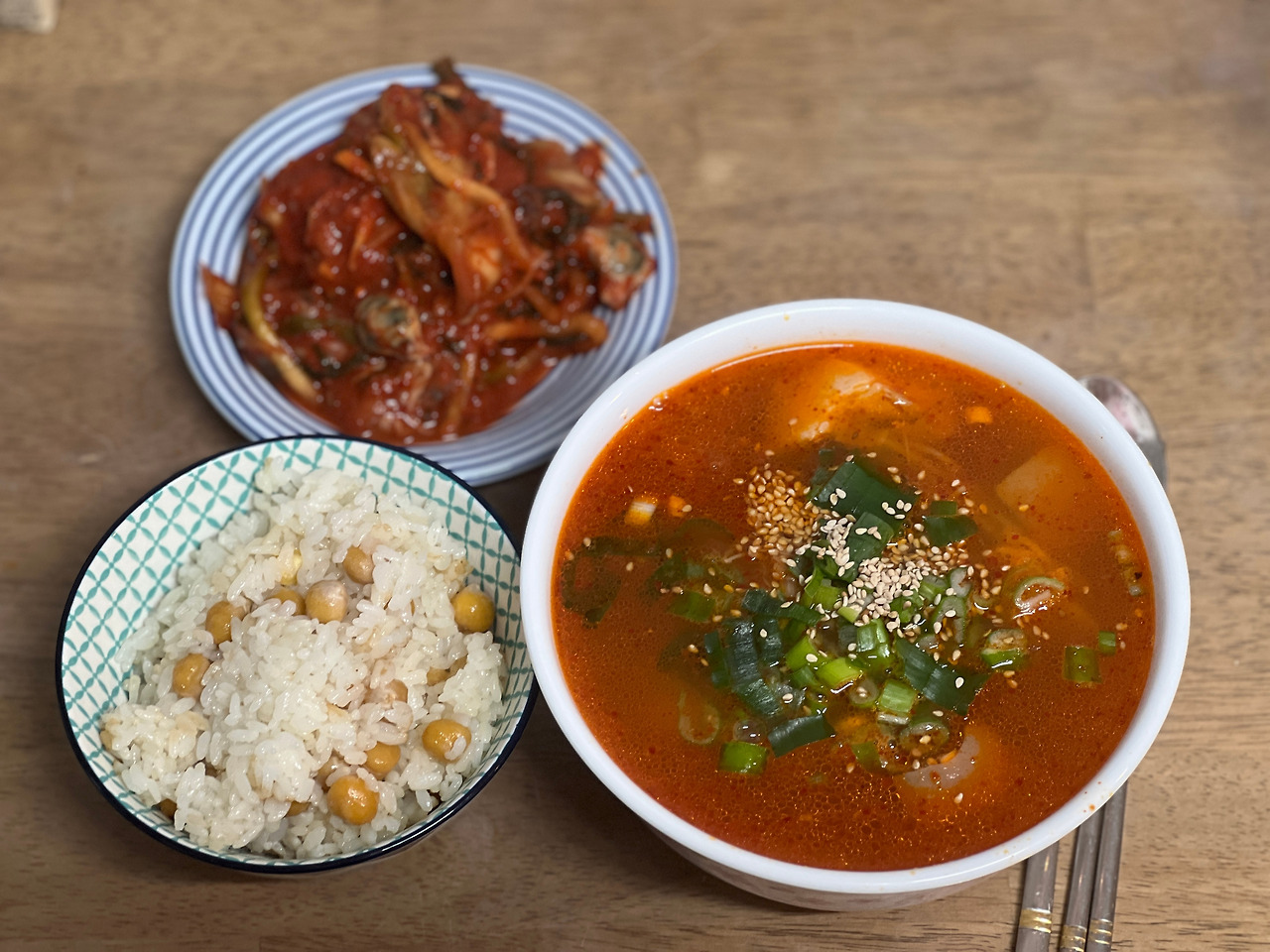 이미 만들어둔 콩나물무침을 국물까지 해서 국 위에 풀었다. 두꺼운 콩나물이 아닌데다가 푹 익히기까지 한 놈들이라 아삭거리는 식감은 없다. 그런데 식감을 살리는 것보다 내 입장에선, 콩나물이 자주 손대는 식재료가 아니었기 때문에 비린내가 안나는 게 더 중요한 문제였다. 그럭저럭 콩나물무침도 맛이 괜찮았고, 그래서 두개 국그릇에 토핑. 그리고 마지막으로 대파를 토핑.