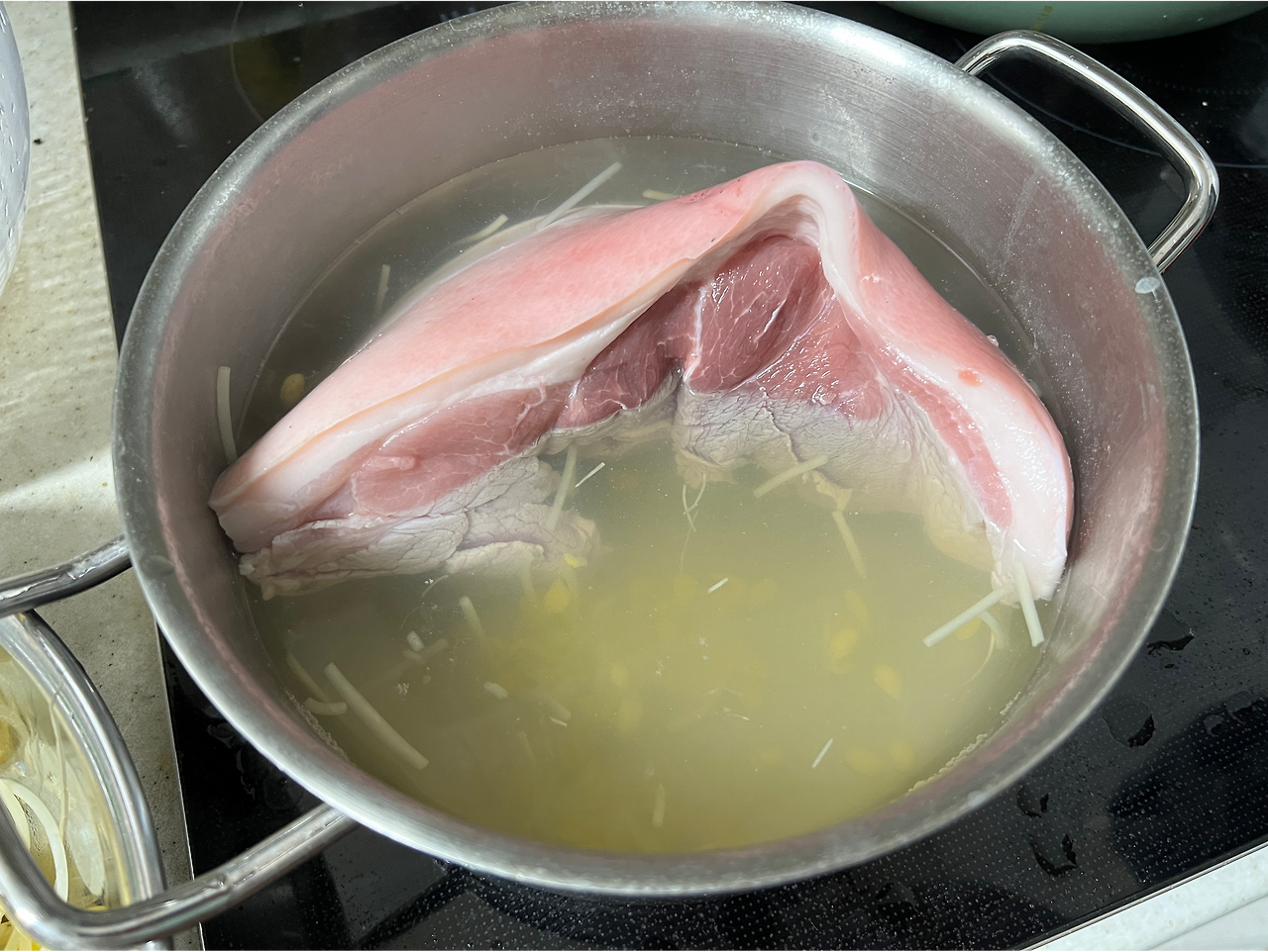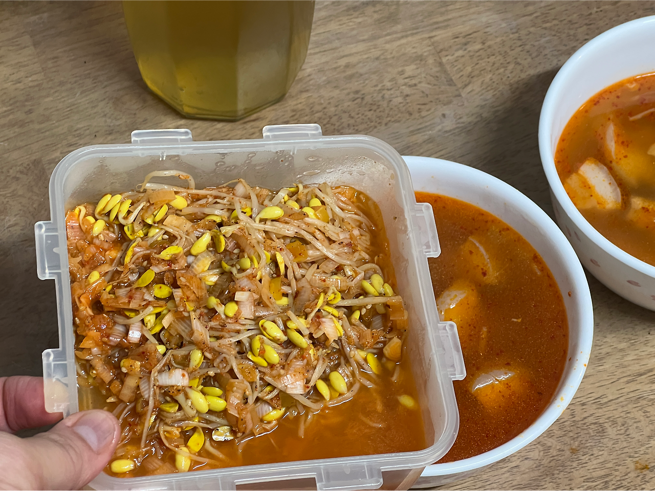 그래서, 콩나물을 일부러 푸욱 익혀가며 육수를 만들고, 거기에 앞다리 살을 두시간 가량 삶았다. 다 삶아진 앞다리 살은 다른 냄비에 옮겨 양념을 해서 약간 졸인 뒤, 아침에 도시락을 싸면서 일부는 콩나물 육수에 다시 넣었다. 그래서 다음날인 오늘, 나는 다시 냄비를 열었다.
