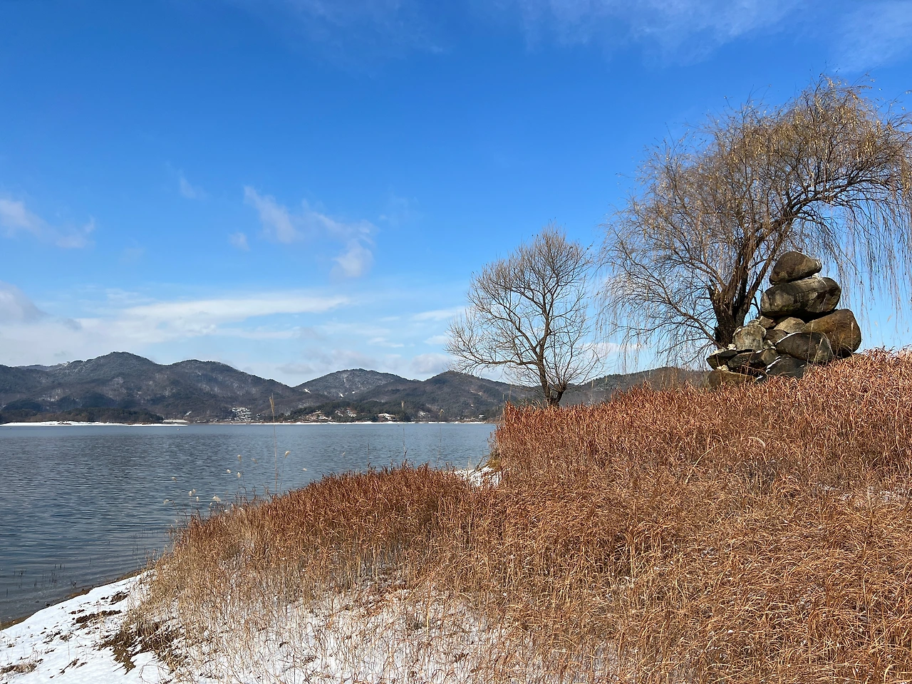 나는 그 돌무지 옆에 서서 물 아래 아버지의 외갓집을, 그리고 바로 건너에 우리 시골집 자락을 바라본다. 저기 멀리에 학교도 보이는데 거기가 아버지의 모교인 것이고. 이쯤 되니, 눈이 그친 화창한 하늘이 고맙기 그지없다. 아직도 눈이 펑펑 내리는 중이었다며 여기까지 와볼 업무를 못냈을 것이고, 와봤더라도 우리 시골집 방향은 눈에 가려 보지 못했을 것이다.