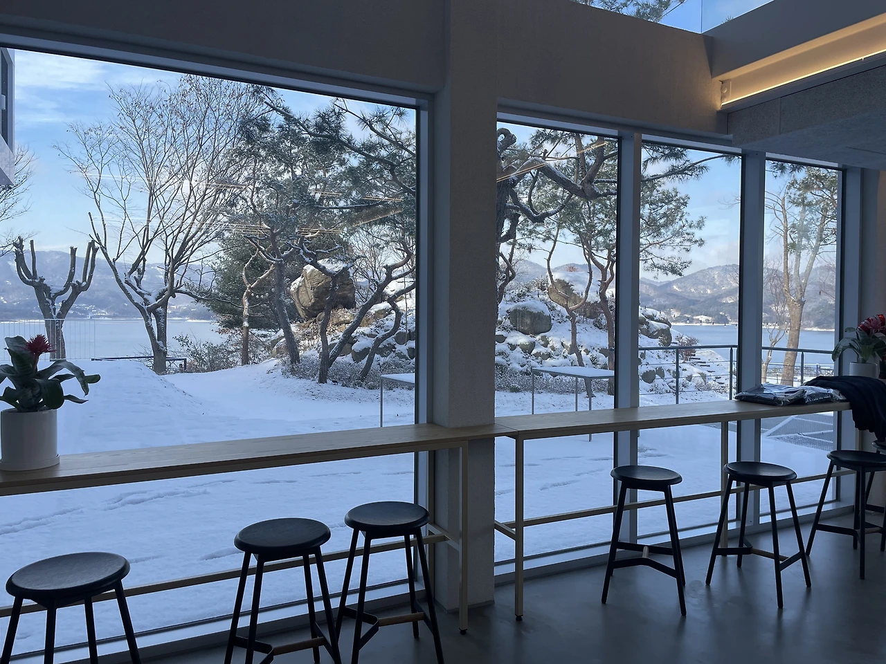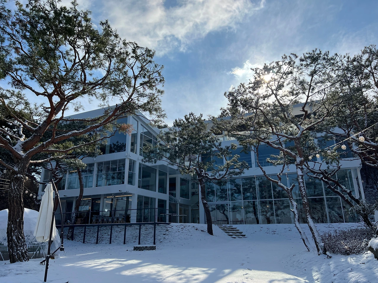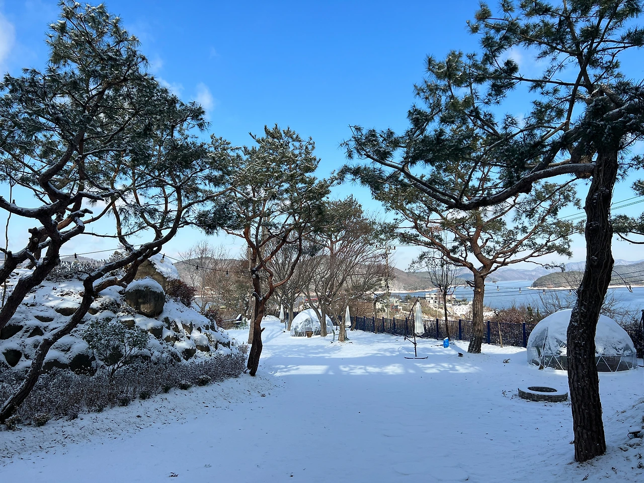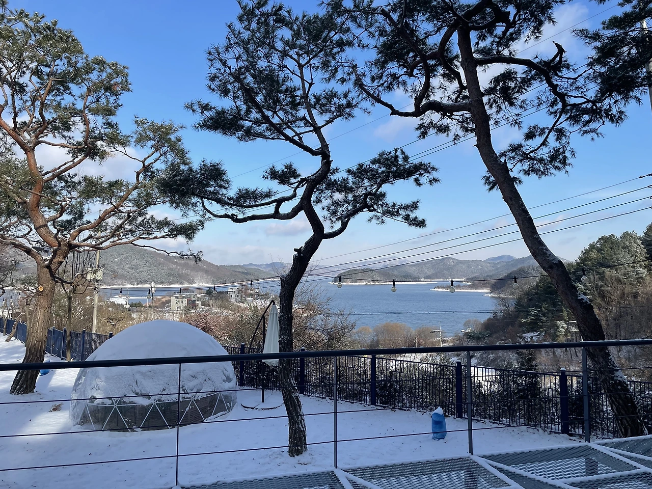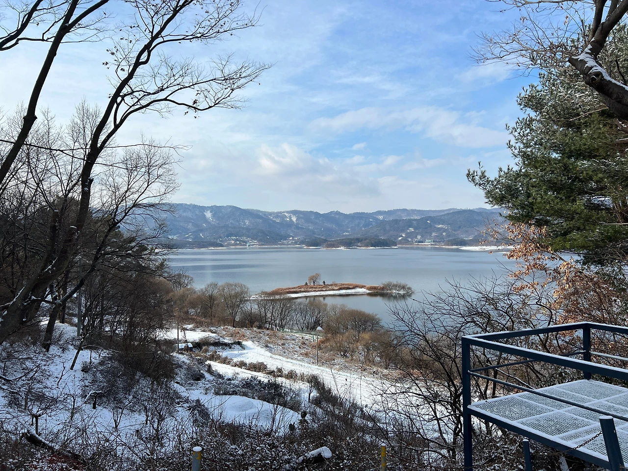 그런데도 또 한시간 반 정도 지났을까. 또 이번엔 하늘이 개기 시작하더니, 12시가 되니 말 그대로 날씨가 "쨍"해졌다. 청명하디 청명한 하늘이 맑은 고기압의 한파와 함께 찾아올 준비를 하기라도 한다는 양. 다른 부부 중 한 팀이 도착했고, 그들과 함께 천천히 눈이 치워지길, 다른 부부가 식사 장소에 도착하길, 하늘이 투명해지길 기다리며 시간을 보냈다.
