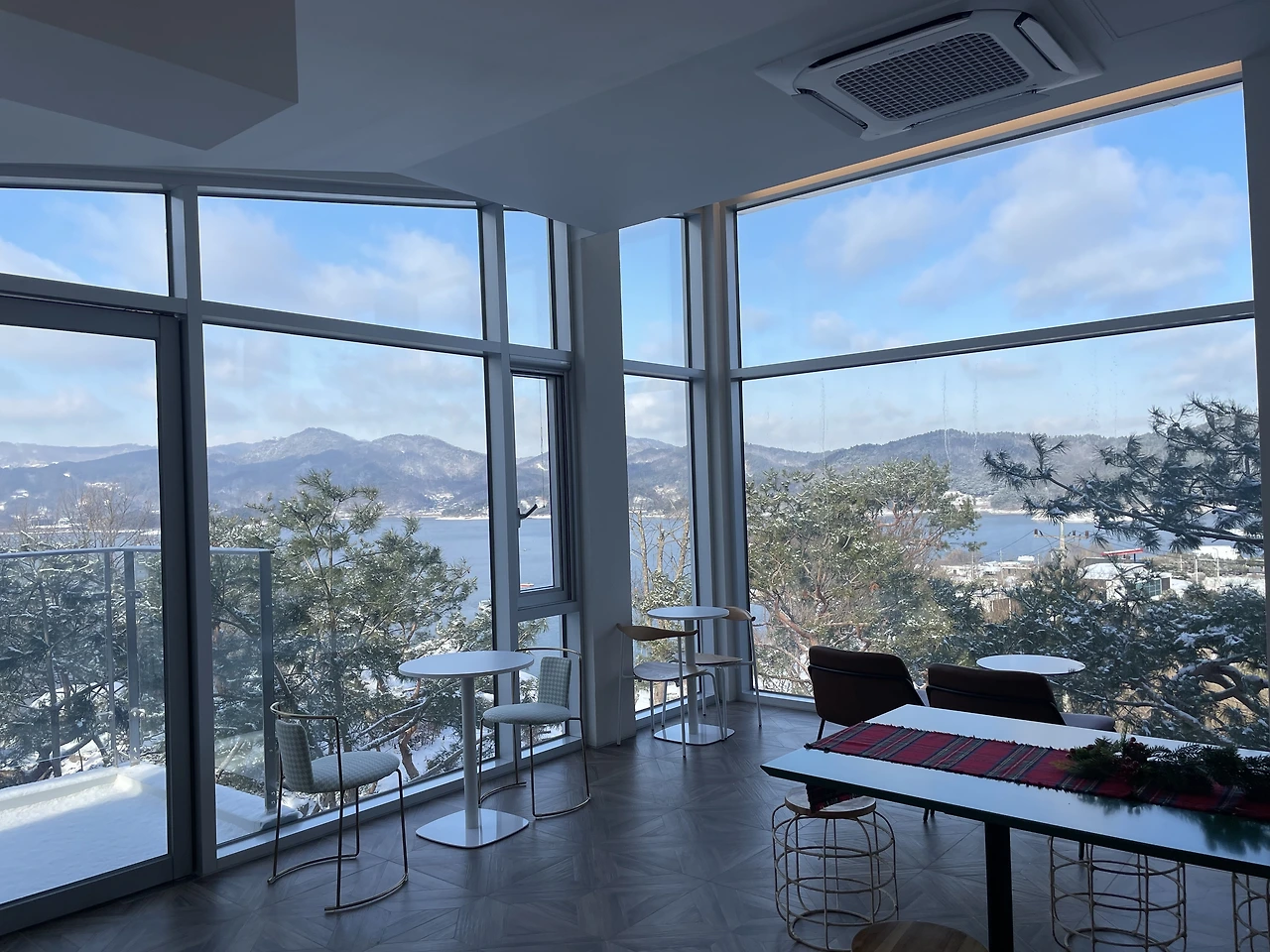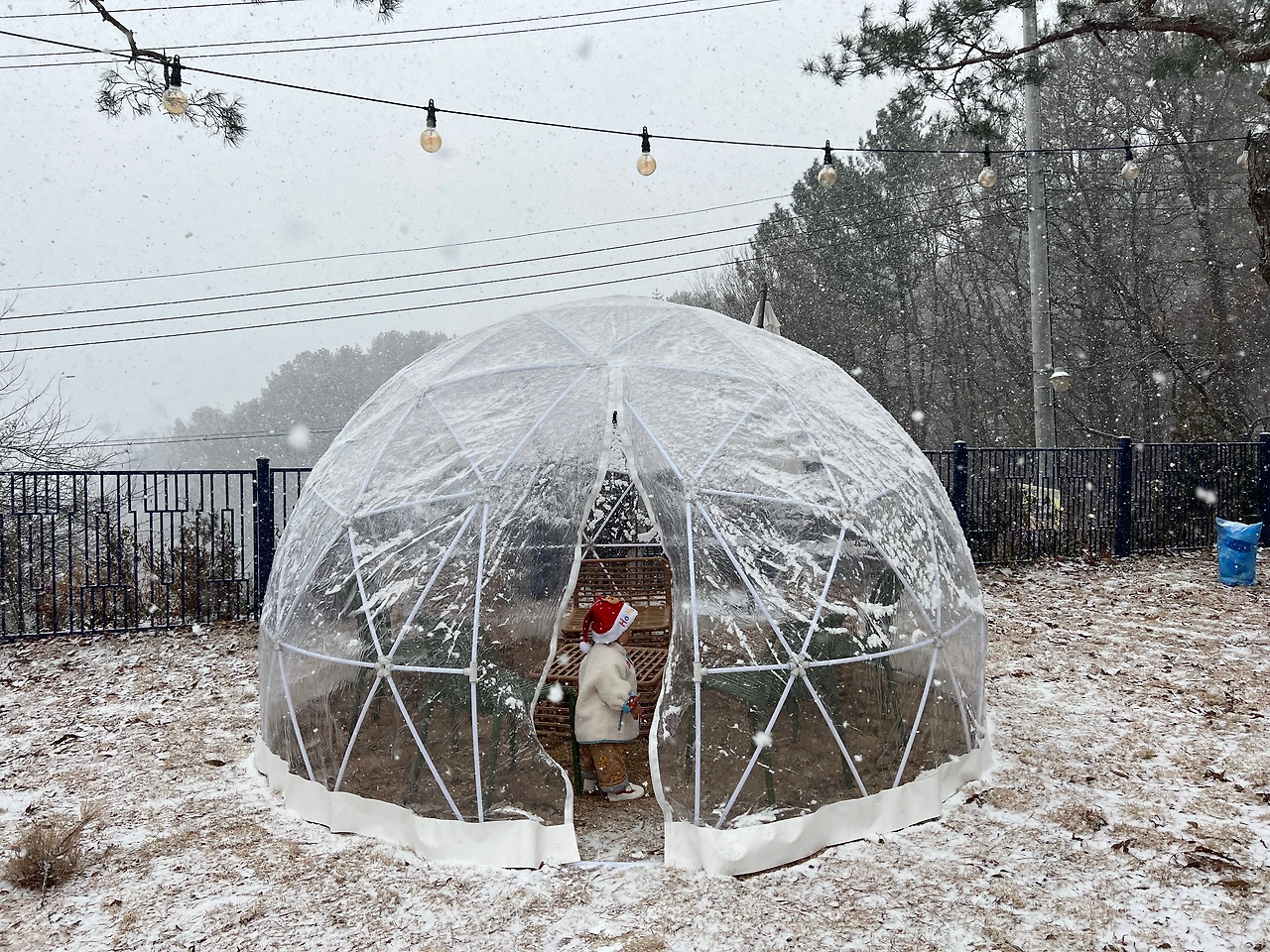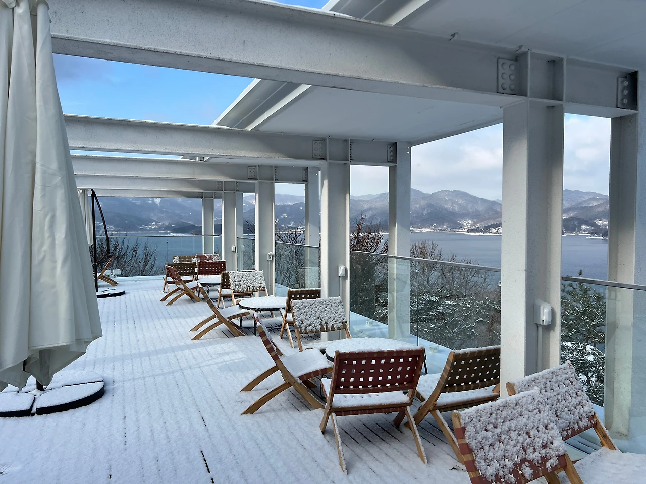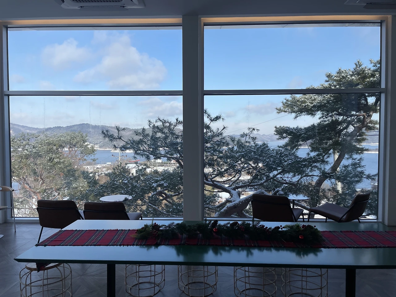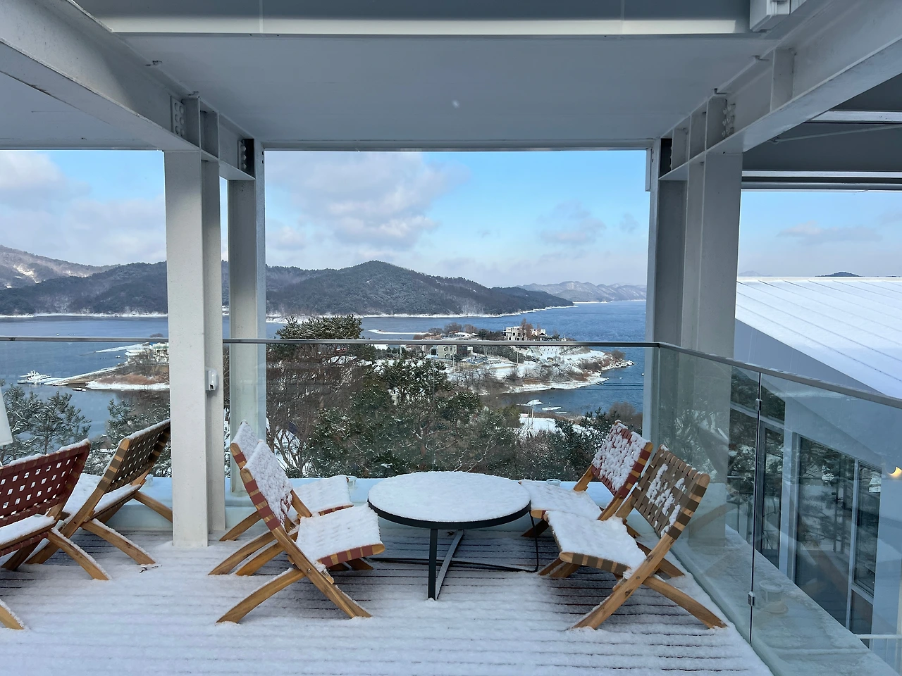 그런데도 또 한시간 반 정도 지났을까. 또 이번엔 하늘이 개기 시작하더니, 12시가 되니 말 그대로 날씨가 "쨍"해졌다. 청명하디 청명한 하늘이 맑은 고기압의 한파와 함께 찾아올 준비를 하기라도 한다는 양. 다른 부부 중 한 팀이 도착했고, 그들과 함께 천천히 눈이 치워지길, 다른 부부가 식사 장소에 도착하길, 하늘이 투명해지길 기다리며 시간을 보냈다.