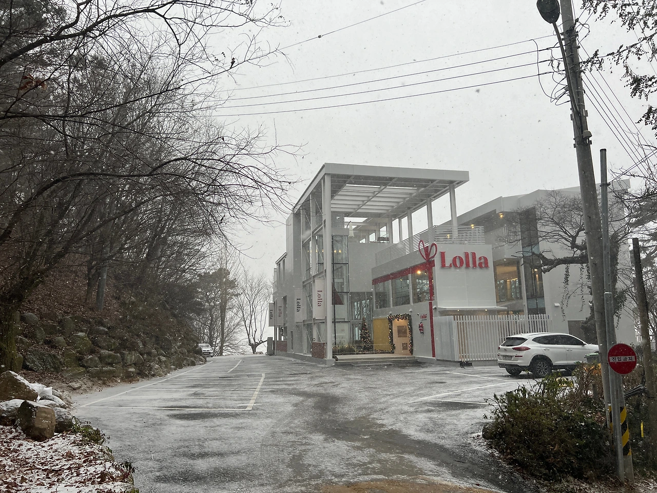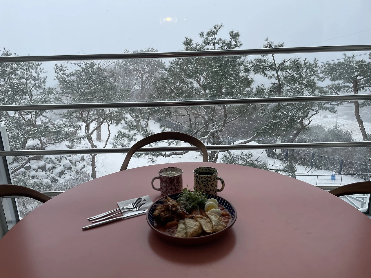 여행은 시작부터 난관에 휩싸였는데, 중부고속도로를 탄 우리는 무탈하게 세시간이 다소 안걸려 약속된 카페에 도착했지만, 경부 고속도로를 탄 다른 부부들은 스트레스를 있는대로 받아가며 폭설로 인한 기나긴 교통체증을 겪어야했다. 그래서 우리 가족만 10시에 카페에 도착했는데 웬걸, 그때까지 눈이 전혀 내리지 않던 대전에 이제 폭설이 쏟아지기 시작했다. 몇 미터 앞이 눈에 가려 보이지 않고, 우리가 막 오른 언덕이 눈으로 인해 차가 오르기 어려워질 만큼.