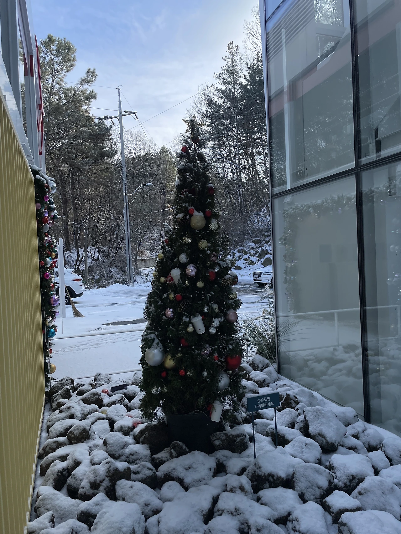 오전 10시 5분. 카페는 갓 오픈하여 빵을 구워 매대에 내고, 쏟아진 함박눈에 급히 대처하기 위하여 통행로에 박스를 까는 등 분주하다. 나는 짐을 풀고, 아이 기저귀를 갈아주고, 아내가 주문을 하고 자기 블로그에 올릴 사진들을 취재하는 동안에 카페에 있던 산타 모자와 루돌프 머리띠를 빌려, 부리나케 밖으로 나왔다.