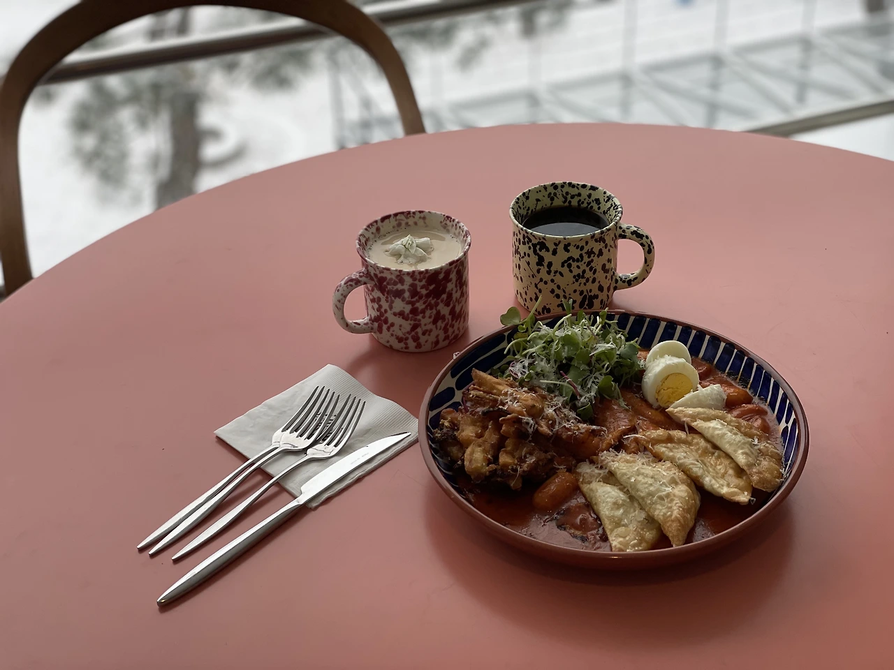 그 와중에 아내는 떡볶이를 시켰다. 떡볶이. 우리가 카페에 도착한 것이 10이고, 나는 오는 동안 미리 아침 끼니로 계획을 하고 챙겨온 베이글을 먹었기 때문에, 이 시점에서는 배가 딱히 고프진 않았다. 반대로 아기를 보느라 베이글이든 뭐든 먹을 여력이 없던 아내는 배가 고팠다.