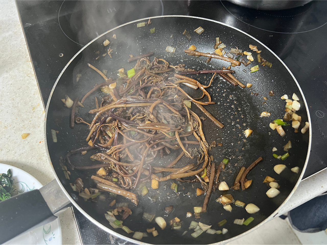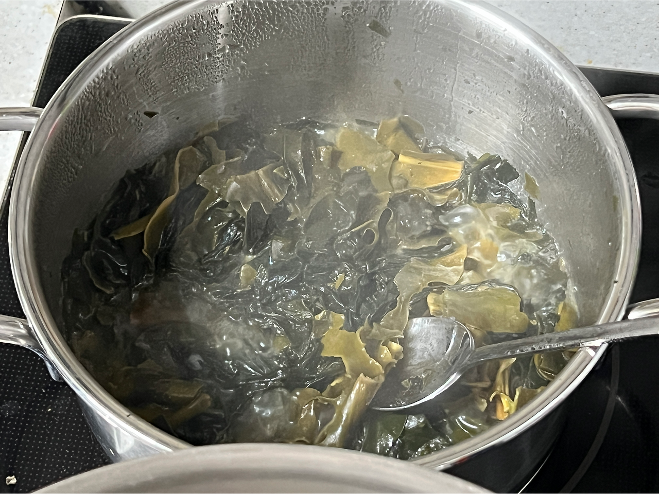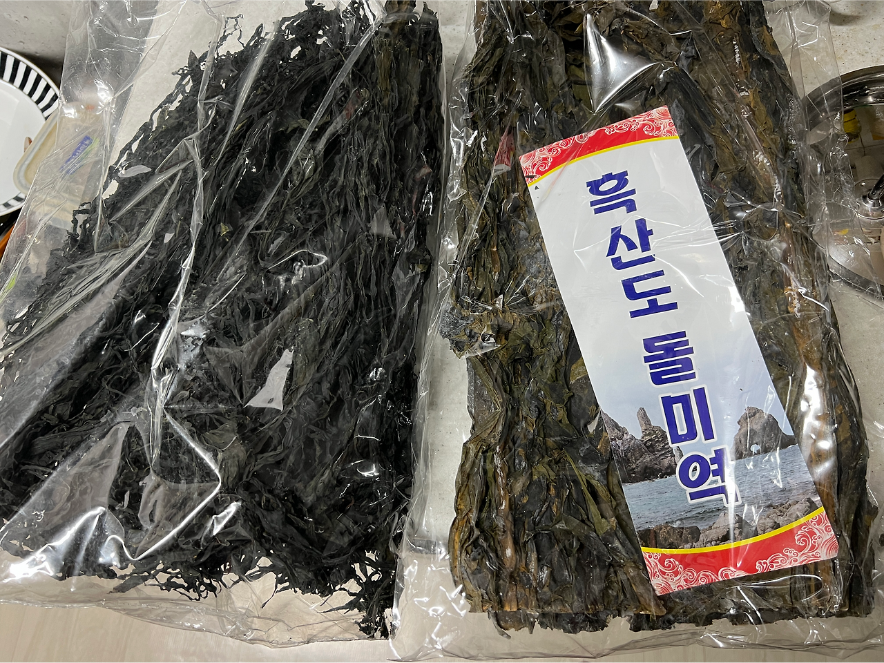 미역은 선물로 받은 게 두개가 있다. 둘 다 좋은 미역이라고 하는데 흑산도는 최근에 엄마가 여행을 다녀오셔서 안기신 것. 나는 고민을 좀 해보고 두 미역 모두 쓰기로 했다. 왼편의 검은 미역도 좋은 미역인데, 아무래도 시판 미역들에 비해선 쓴맛이 있는 편. 끓인 물에 조각조각 낸 미역을 넣어 불리면서 이내 들기름도 넣는다. 드글드글드글, 미역의 세포들을 최대한 터트리면서.