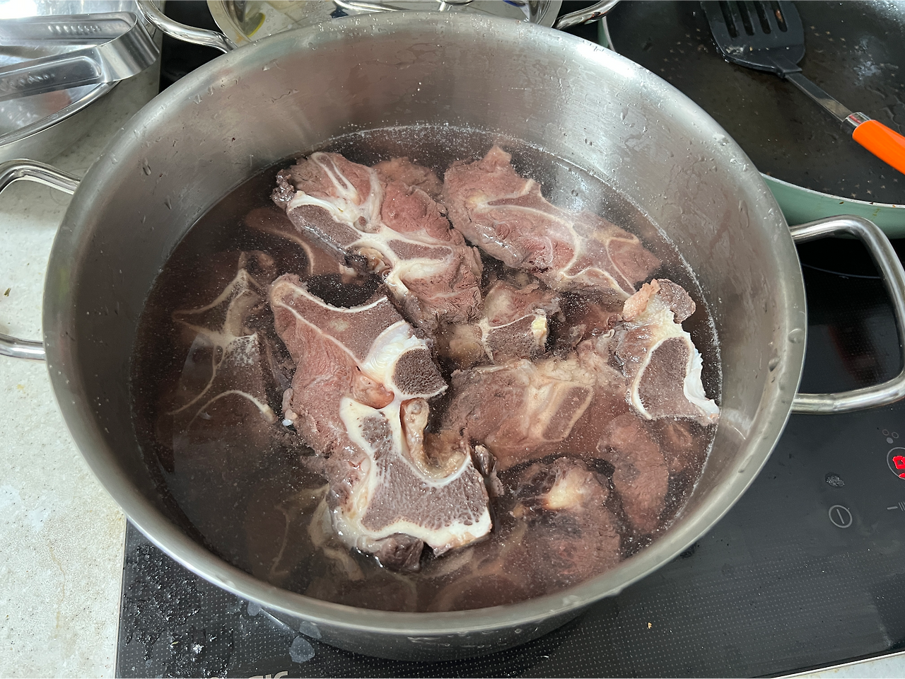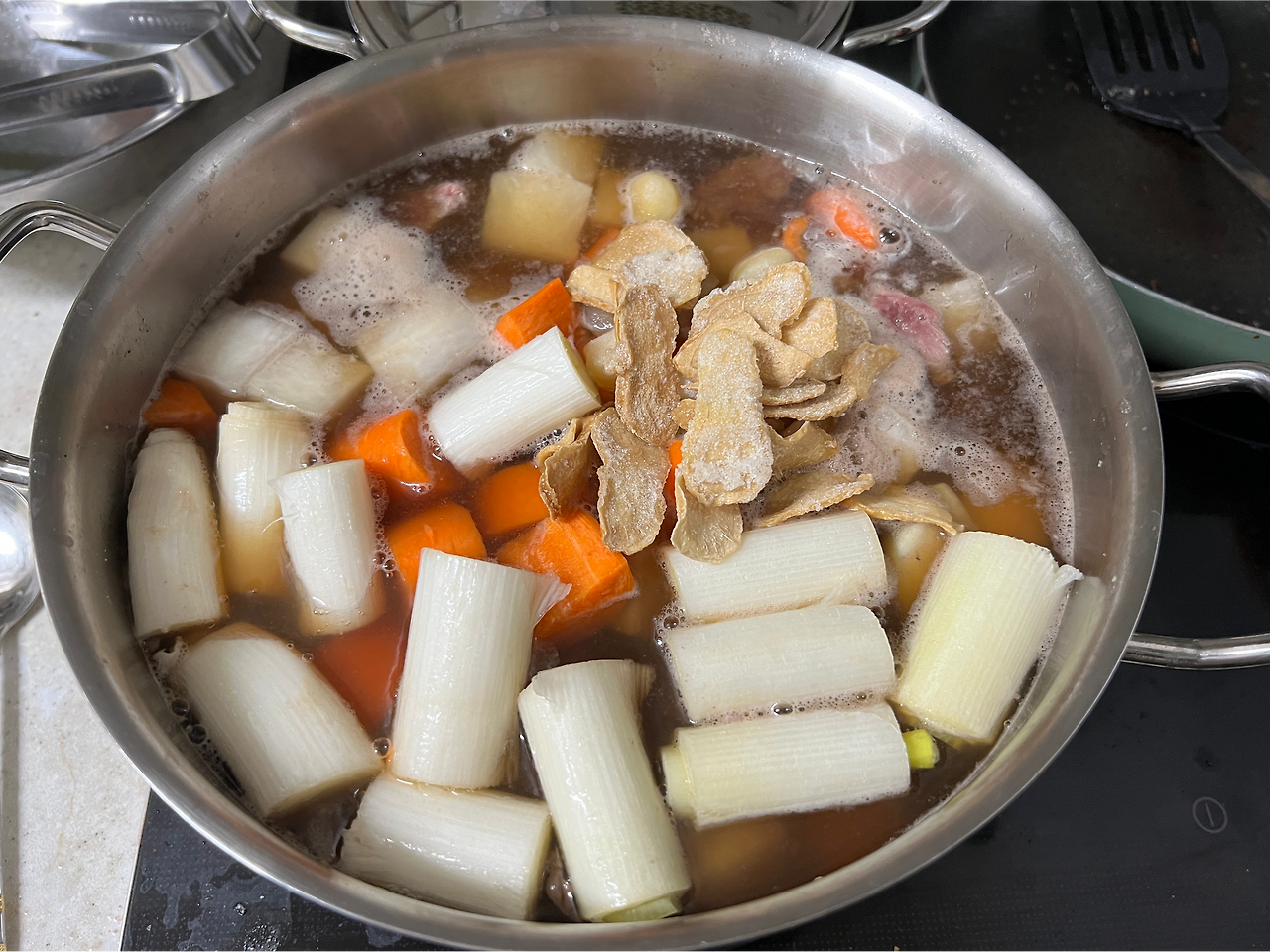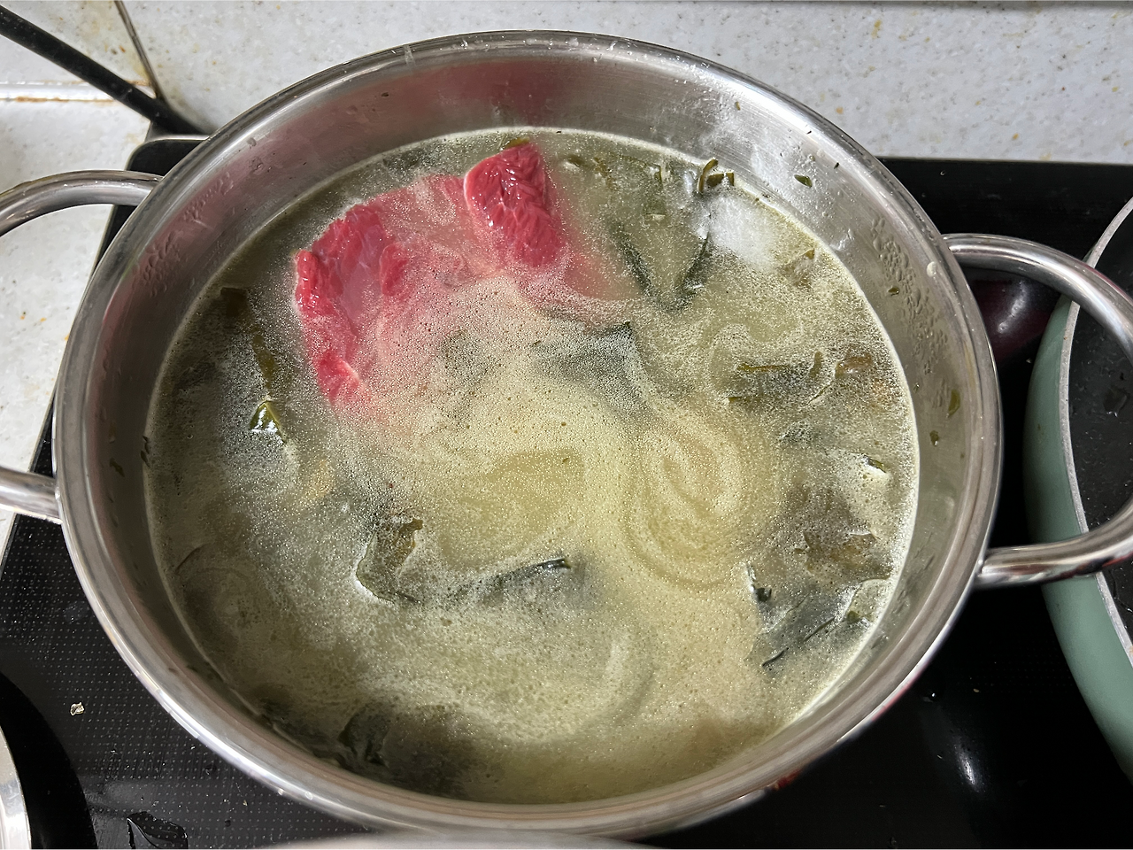 한 15분 가량 충분히 볶아준 미역들이라 이제 소고기와 함께 물을 넣으니 이미 뽀얗게 국물이 우러나 있다. 뚜껑을 닫고 당분간 작별이다. 고기는 평소엔 양지를 쓰다가 오늘 사태를 사서 넣어봤다. 첫번째 그리고 가장 중요한 미역국은 일단 해결.