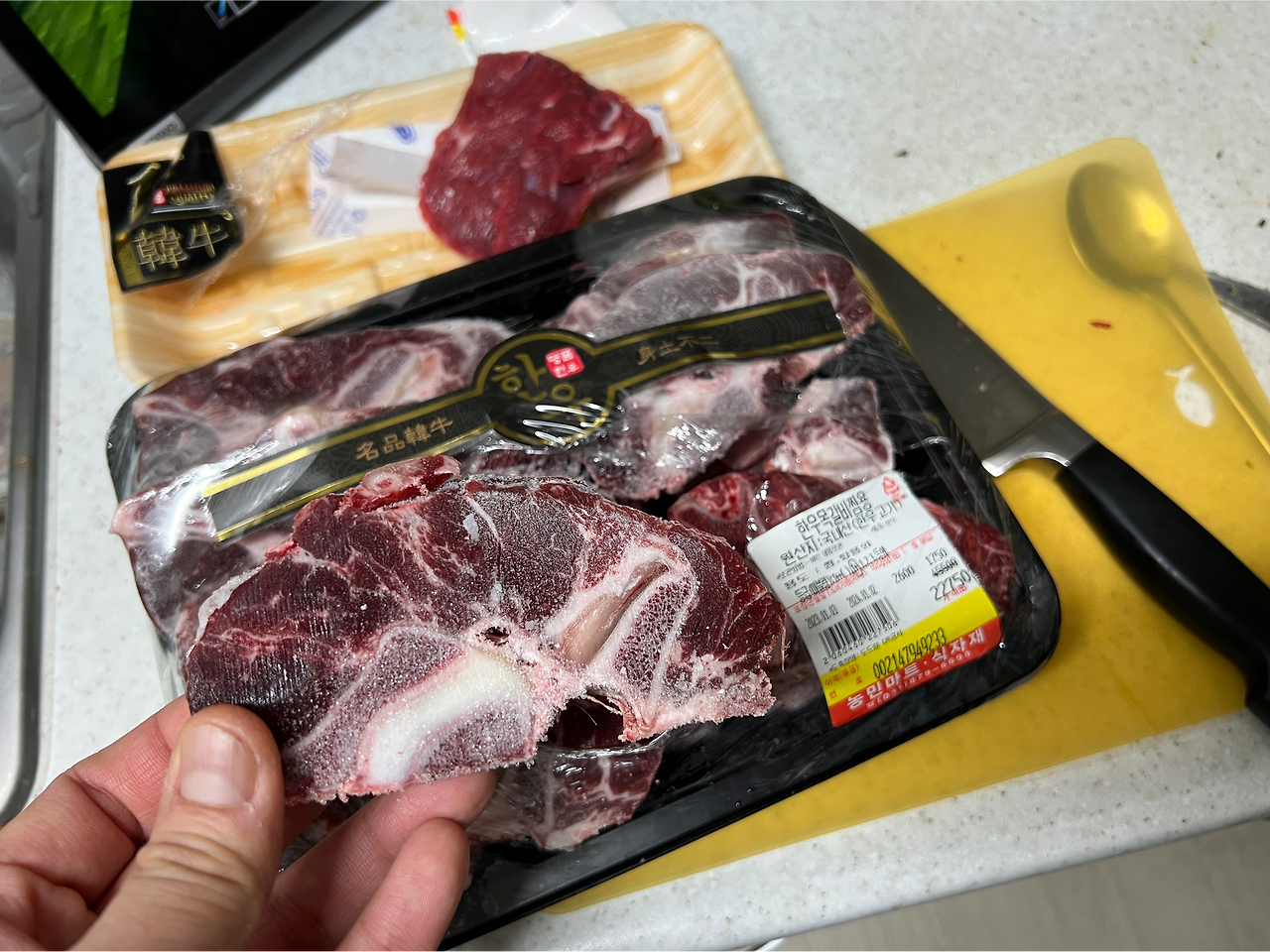 그리고 좀 특이한 갈빗대를 샀는데, 마트에 가서 보니 일반 찜갈비는 2만원에 500그램 정도 가격. 근데 장모님도 와 계신데 값도 조금 나가고, 아무리 한끼여도 그래도 갈비인데 양은 넉넉해야겠어서 고민을 하다가 엉뚱한 놈을 샀다. 목갈비? 라고 하는데 실상은 돼지 감자뼈와 비슷한, 고기를 성형해내가고 남은 사실상의 잡뼈를 갈빗대라고 판다.