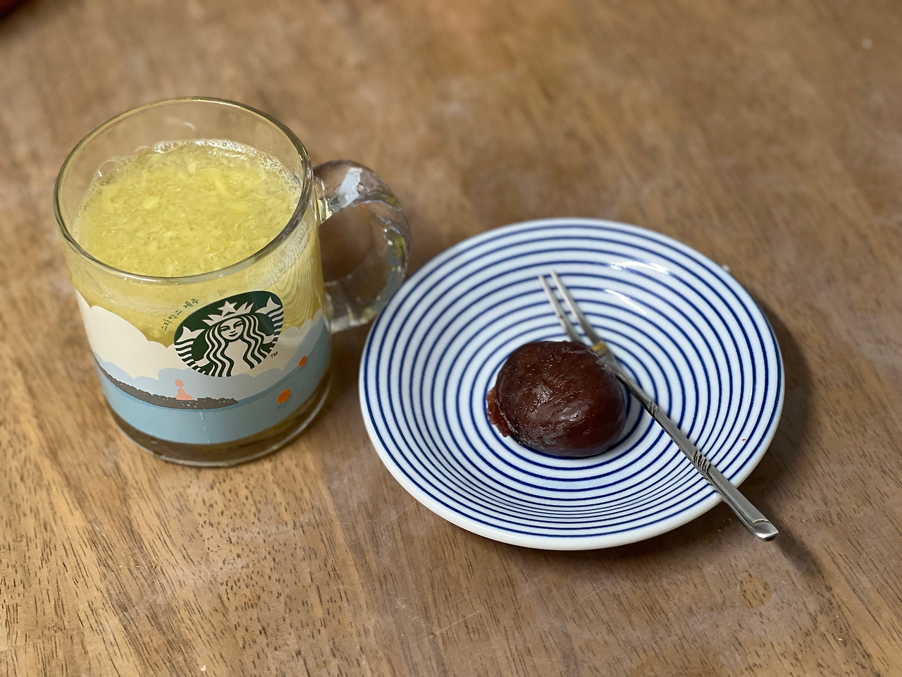 우선, 생강청귤차 한잔 끓여서 바깥양반에게 나의 첫 밤조림을 진상한다. 아마도 그것은 부드럽고 보드라운 달콤함이겠지. 우리 아기의 볼살처럼 말이야.