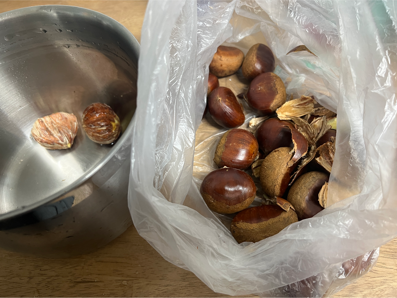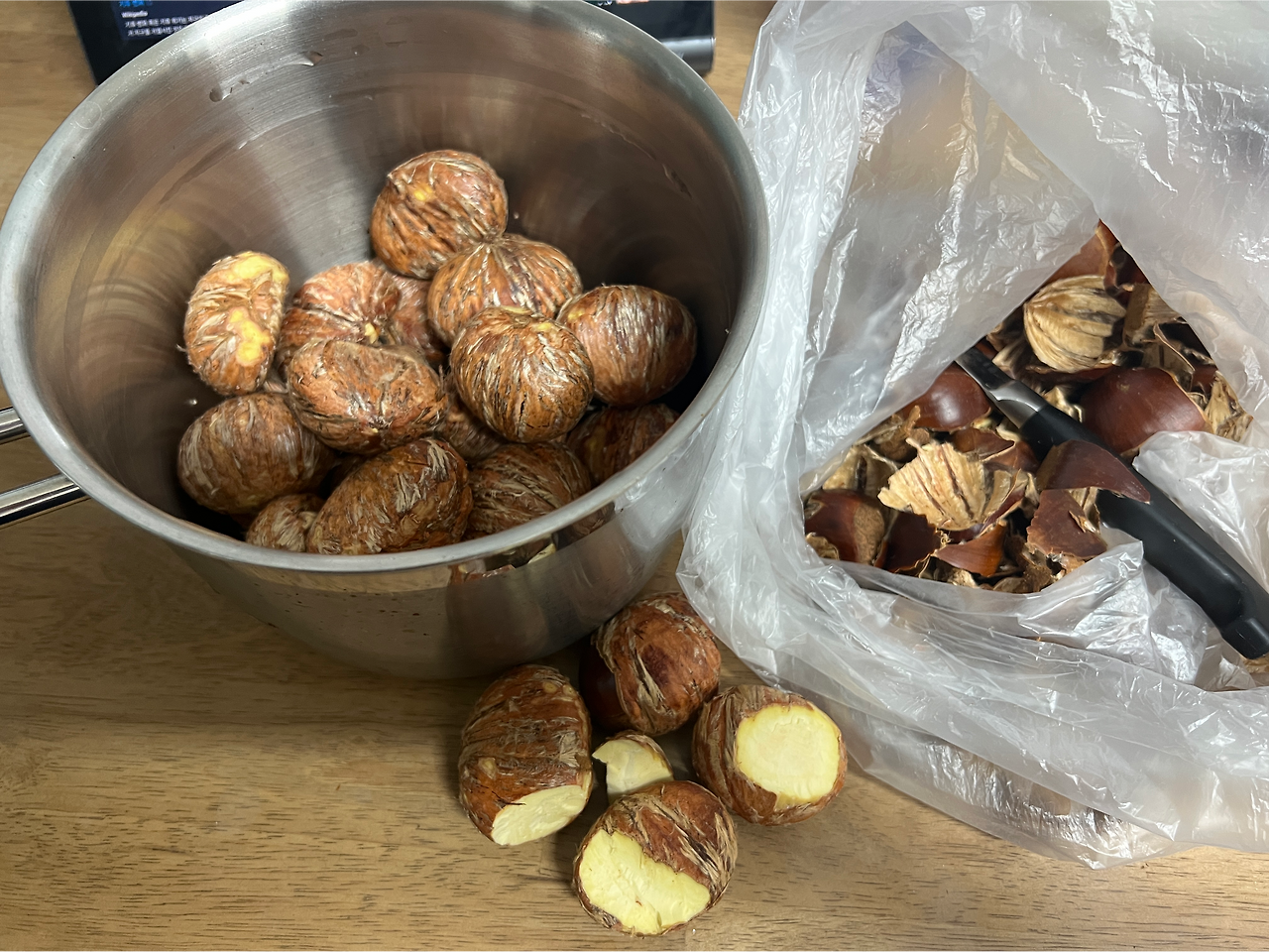 그러나, 간단히, 밤에, 밤껍질을 까고, 밤 사이에 열두시간 정도 베이킹소다와 함께 불렸다가, 30분씩 세번. 그리고, 속껍질의 털과 심을 발라내는 아주 단순한 작업 시간.