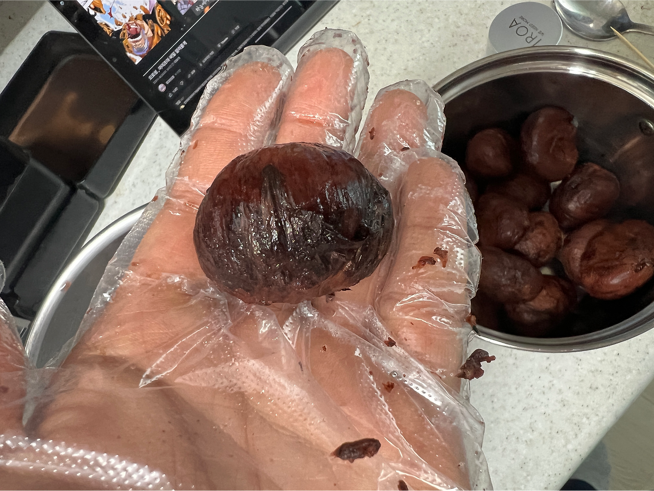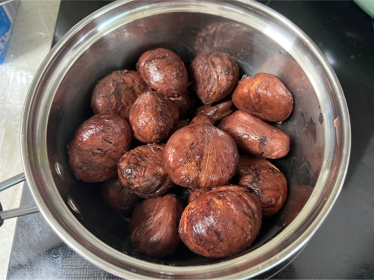 다 되었다. 껍질 까는 것보단 훨씬 수월한 작업이다. 이쑤시개로 살살 심도 털도 벗겨낸 뒤에 이제 드디어 마지막 작업이다. 밤의 1/2 분량의 설탕, 적당량의 물을 붓고 약불에 살살살살 졸이는 시간이다.
