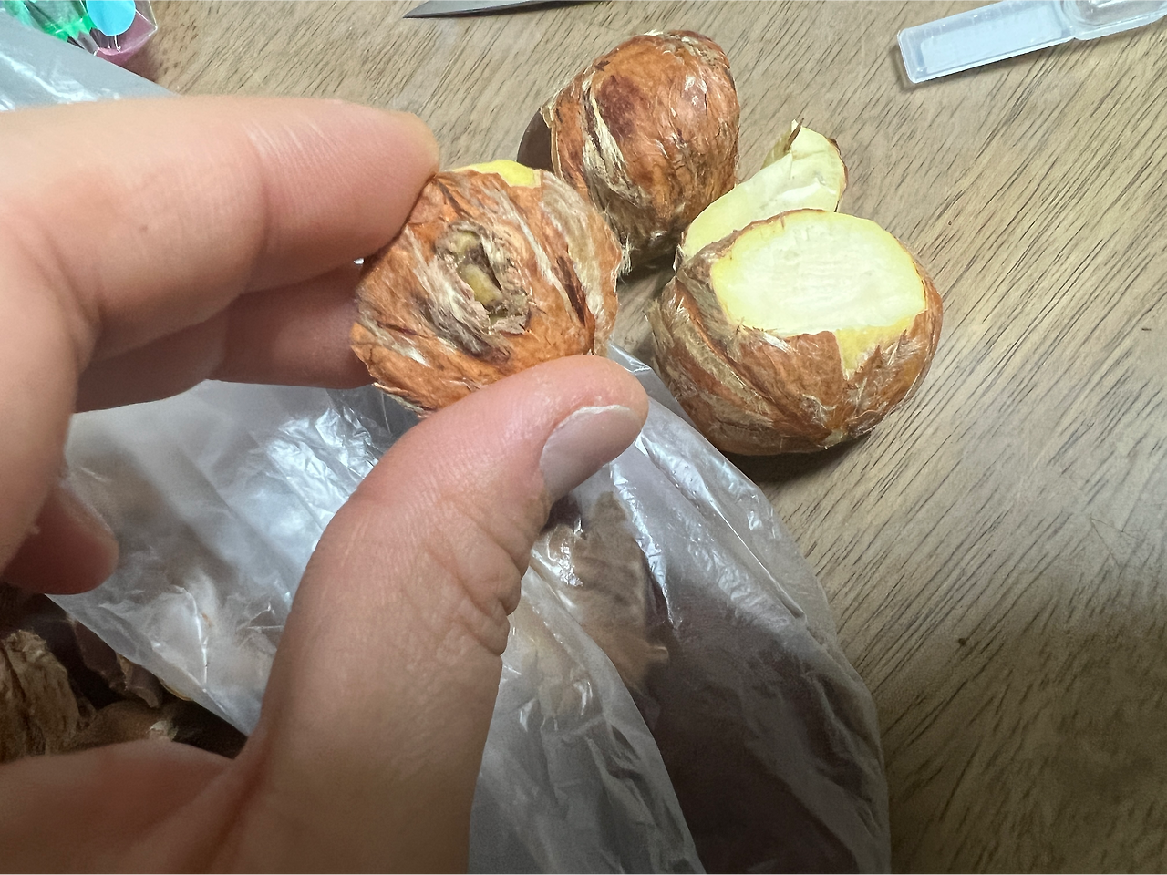 그리하여 1kg 살짝 넘는 분량의 밤을 다 까니, 네 알의 벌레먹은 밤알, 거기에서 벌레 파먹은 부위를 골라내고도 열댓알이 남았다. 7천원이라고 치자. 이정도면 확실히 싼지는 모르겠다. 가격은 나에게 중요한 문제다. 아이에게 먹일 음식이므로 이왕이면 저렴하면 좋을 테니까.