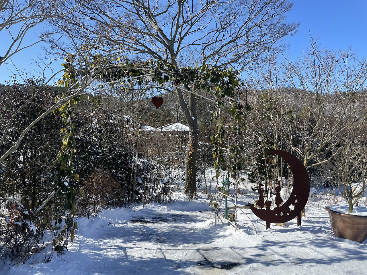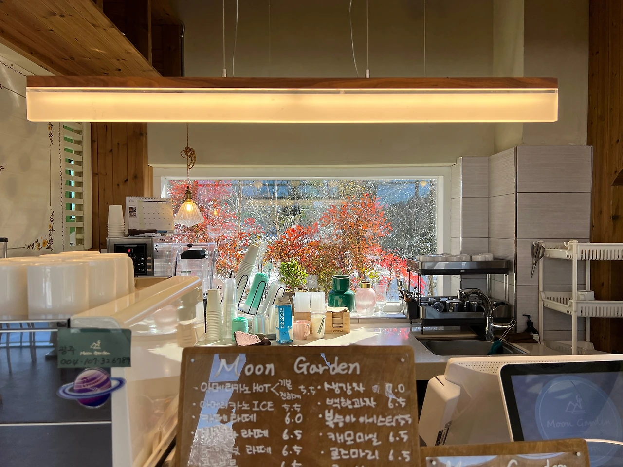 아이를 놀리면서 내내 서 있으려니 카운터 자리의 환함이 눈에 들어온다. 정면의 밖뜰의 하얀 설경에 비하여 후원이자 입구 방향에는 또 울긋불긋 환하고 밝은 장면이다. 밖뜰이 주는 고요함도, 안뜰이 주는 찬란함도 모두 좋다. 차가운 설경을 보다가 따스한 붉은 잎새들을 보니 마치, 겨울 길 긴 거리 끝에 발견한 산수유 열매를 본 것 같아 위안이 되었다.