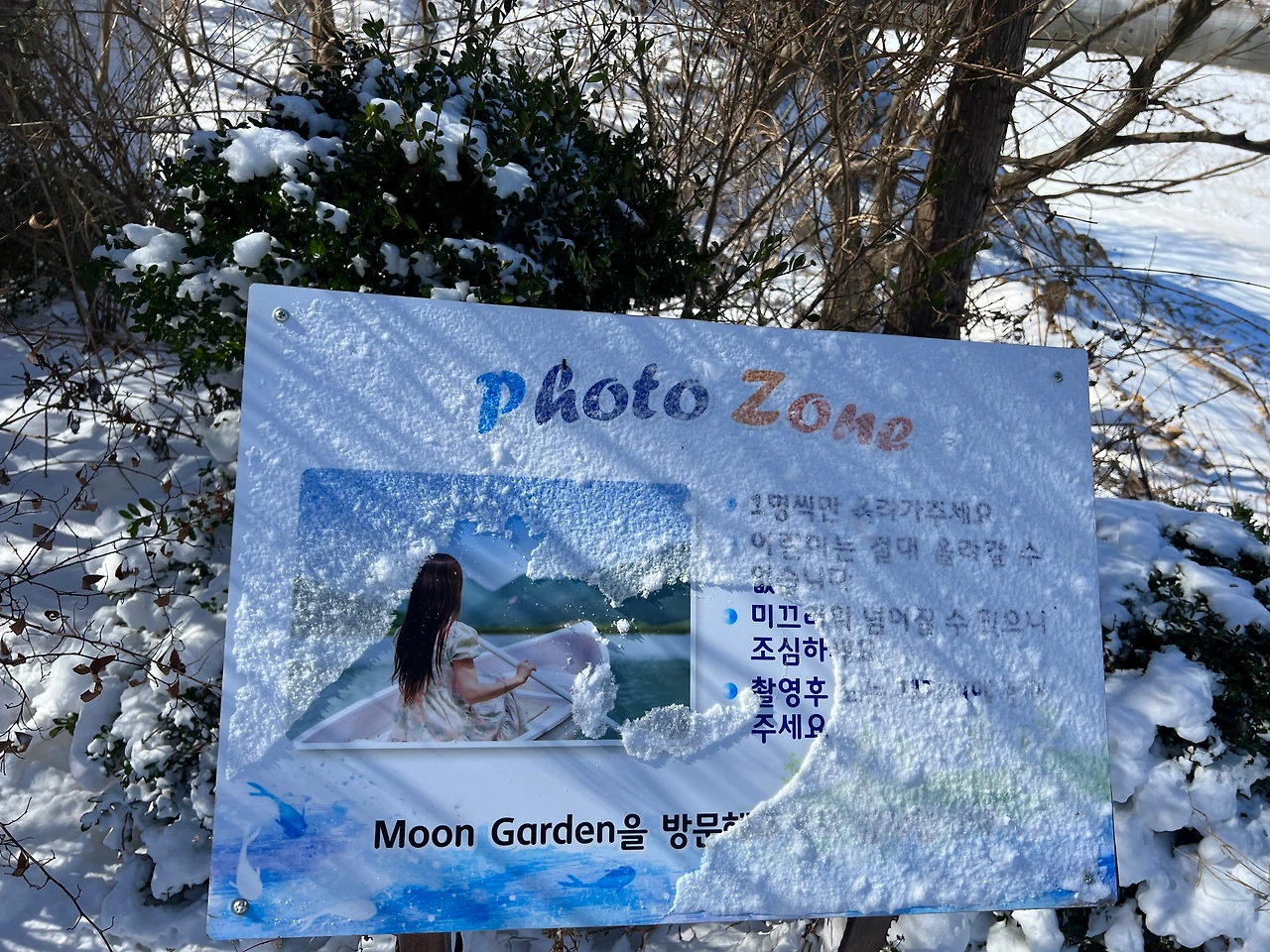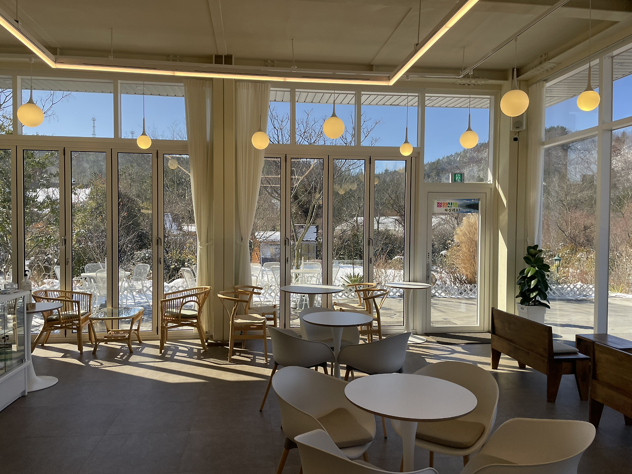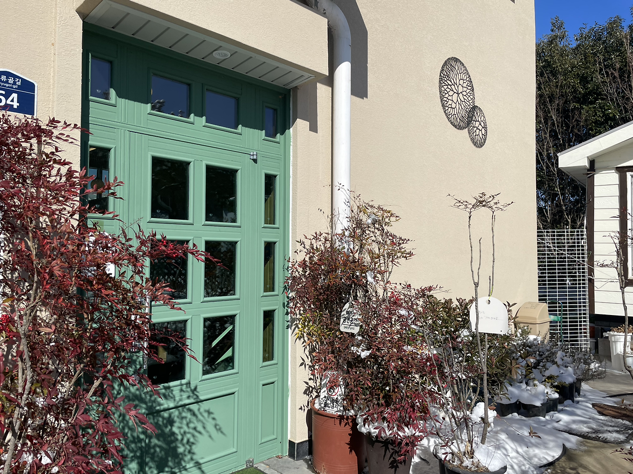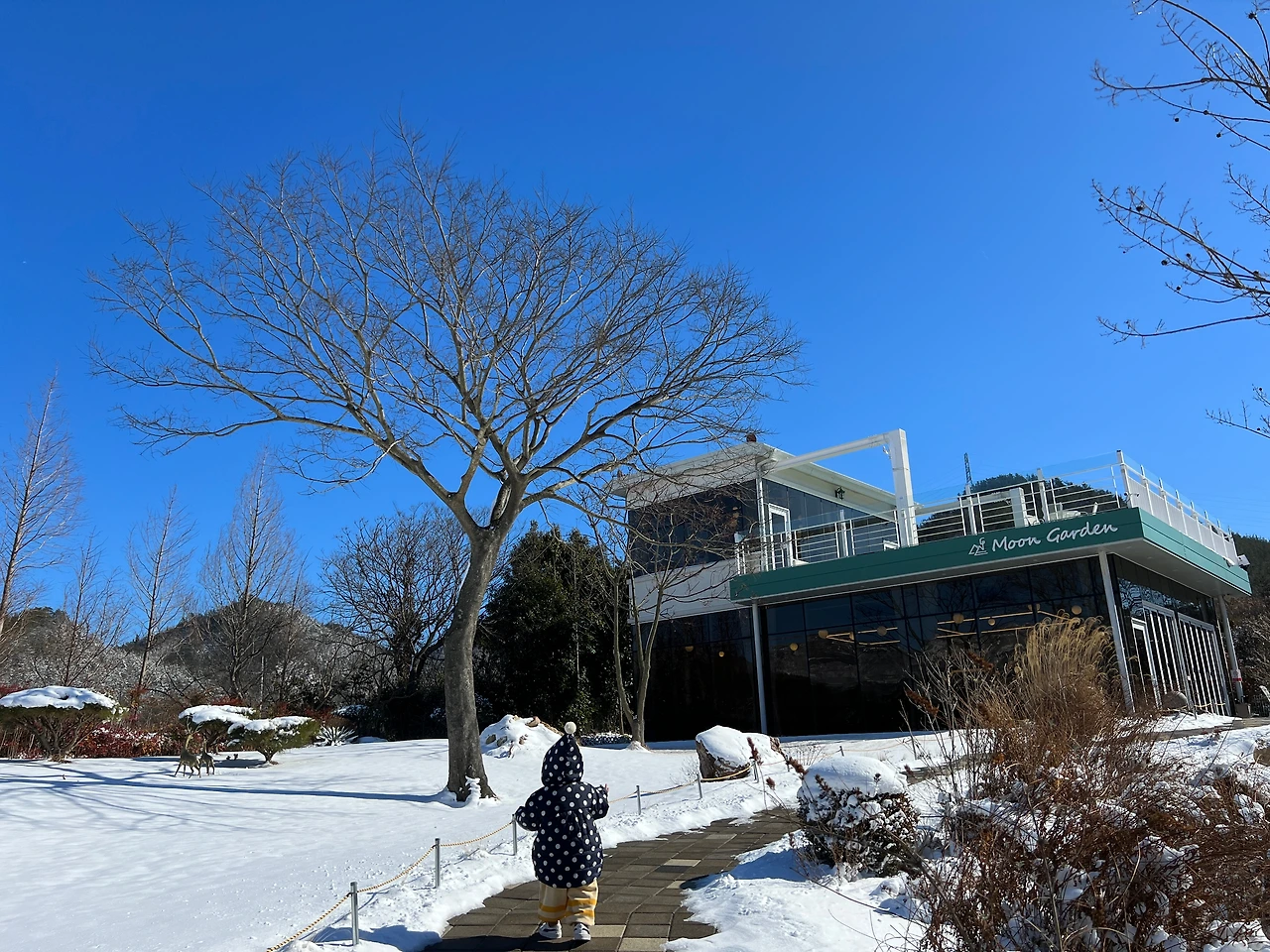 멋진, 그러나 드물진 않은 큰 현관문을 밀고 들어가니 멋진, 그러나 역시나 드물진 않은 흰색의 벽, 흰색 커튼, 미색 전구들이 우릴 반긴다. 여기까진, 익숙하고 편안한 풍경. 그러나 여길 찾은 건 다른 이유가 있었다. 지역 협력사업으로 꽤나 큰 정원을 끼고 있는 카페인데다가, 저수지를 면하고 있어 호수뷰까지 갖췄다. 그래서 1년 내내 다양한 풍광을 즐길 수 있다는 장점으로 택한 곳이다. 짐을 두고 아이를 안고 밖으로 나온다. 눈 때문인지 손님은 아직 우리 밖에 없다.