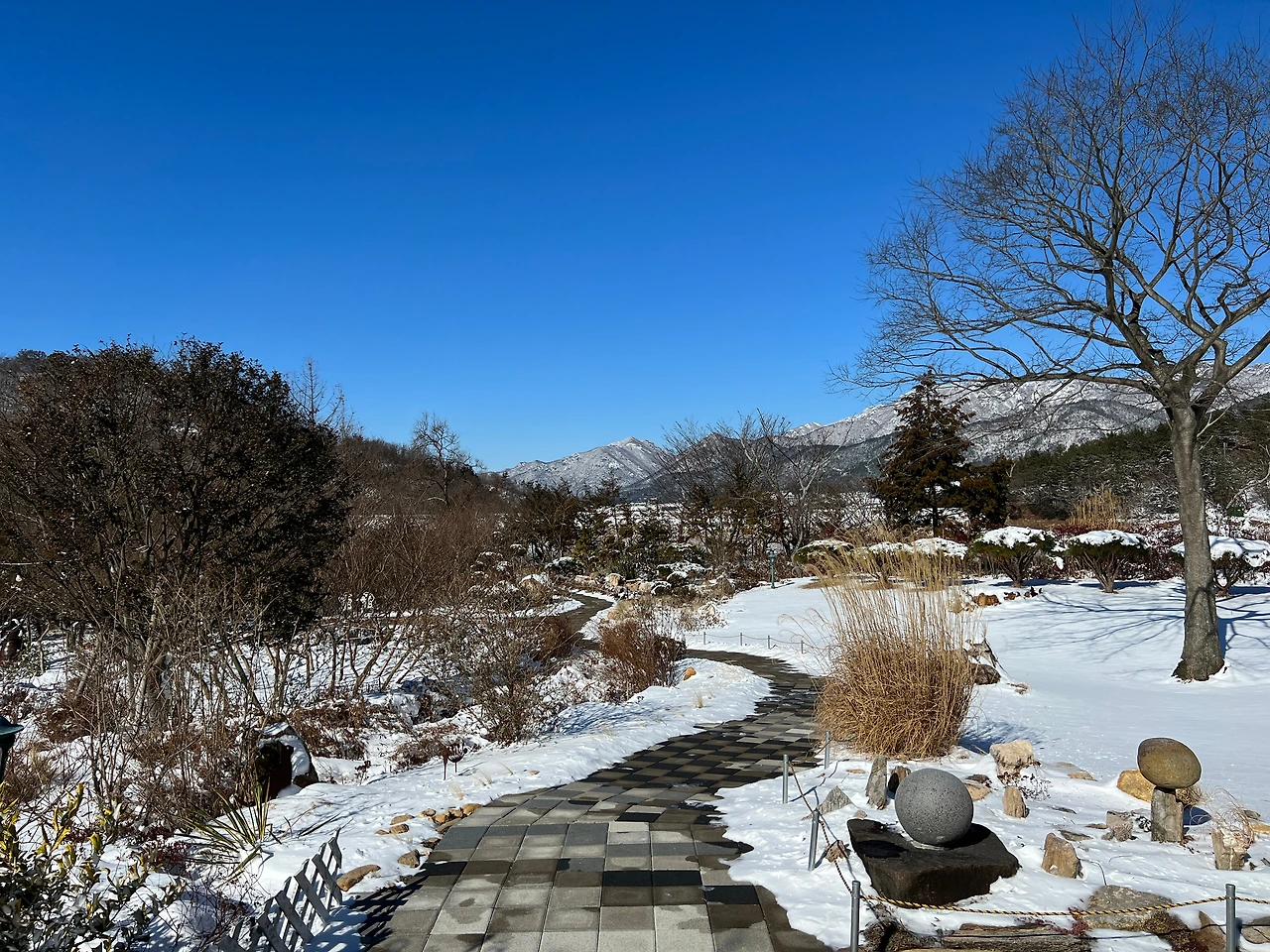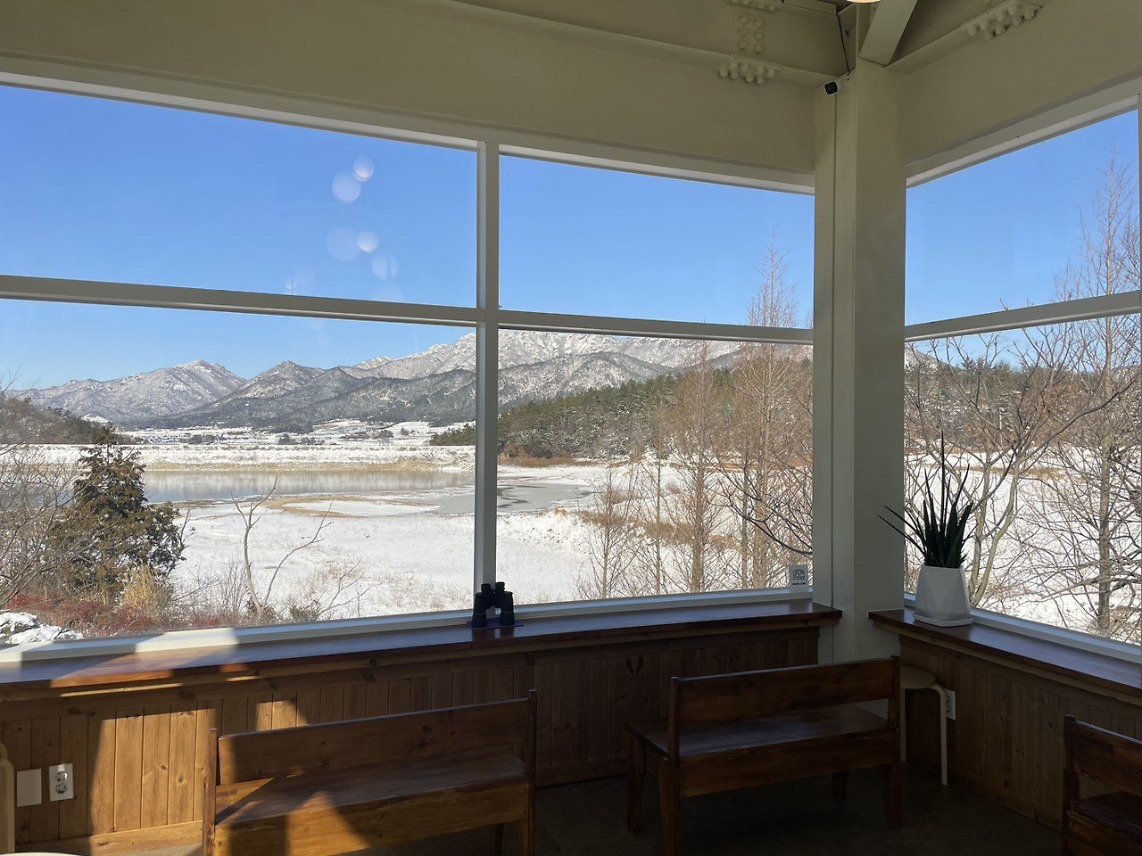 산에 감싸인 자리라 바람은 심하지 않았다. 다만 워낙에 한파라 밖에 오래 있긴 어려웠다. 그래서 여러모로 아쉬운 방문이었다. 하늘은 티 없이 맑지, 들과 산의 설경은 찬연하지, 거기에 여섯시간의 피로를 풀고자 찾은 곳이라 한갓지게 좀 쉬다 갔으면 좋으련만, 30분 안에는 다시 엉덩이를 떼기로 하고 들른 곳이다. 그래서 커피를 주문하고도 밖에 나와서 구경을 하느라 몇 모금 마시지도 못했다.