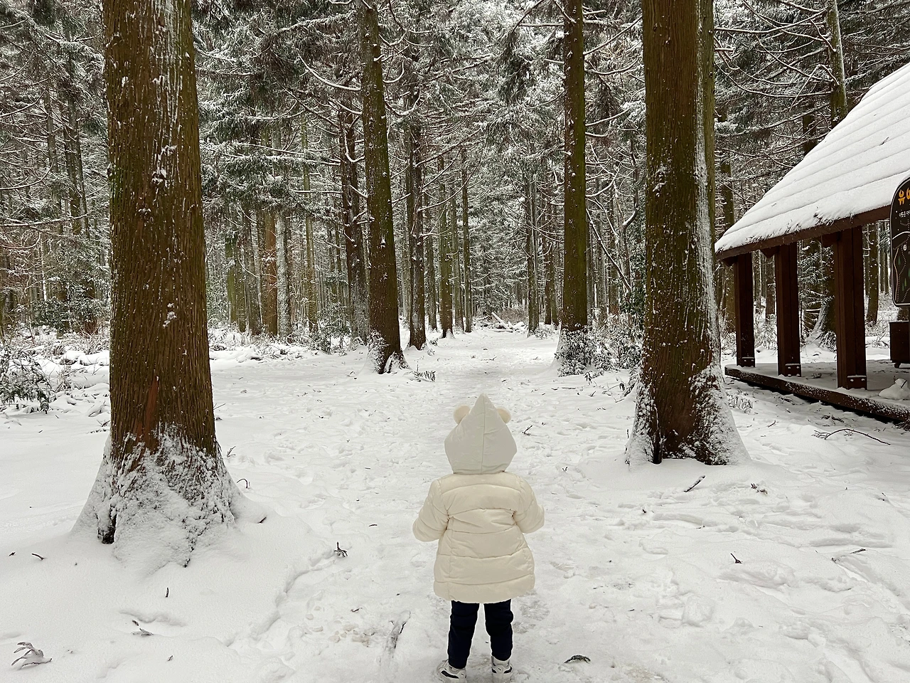 우리는 눈 내린 비탈길을 올라 사려니숲길로 향했다. 앞이 잘 보이지 않는 눈보라를 맞으며 어렵게 어렵게 차를 몰아 올라갔는데 사려니숲길은 입장이 통제된 상태. 아쉬워하며 차를 돌리려다가 바로 옆 어린이 생태학습장은 막혀있지 않은 걸 보았다. 차를 잠시 세워 아이에게 옷을 입혀 달려갔다. 그러나, 눈밭에 세워두고 사진을 찍으려니 아이는 잠투정과 겁이 난 것이 섞여서 바로 울음을 터트린다. 얼른 안아주고 달랜 뒤, 아주 잠깐 내려서 사진을 찍어준 뒤 다시 안았다. 자연처럼, 아이 역시 마음대로 되지 않는다.