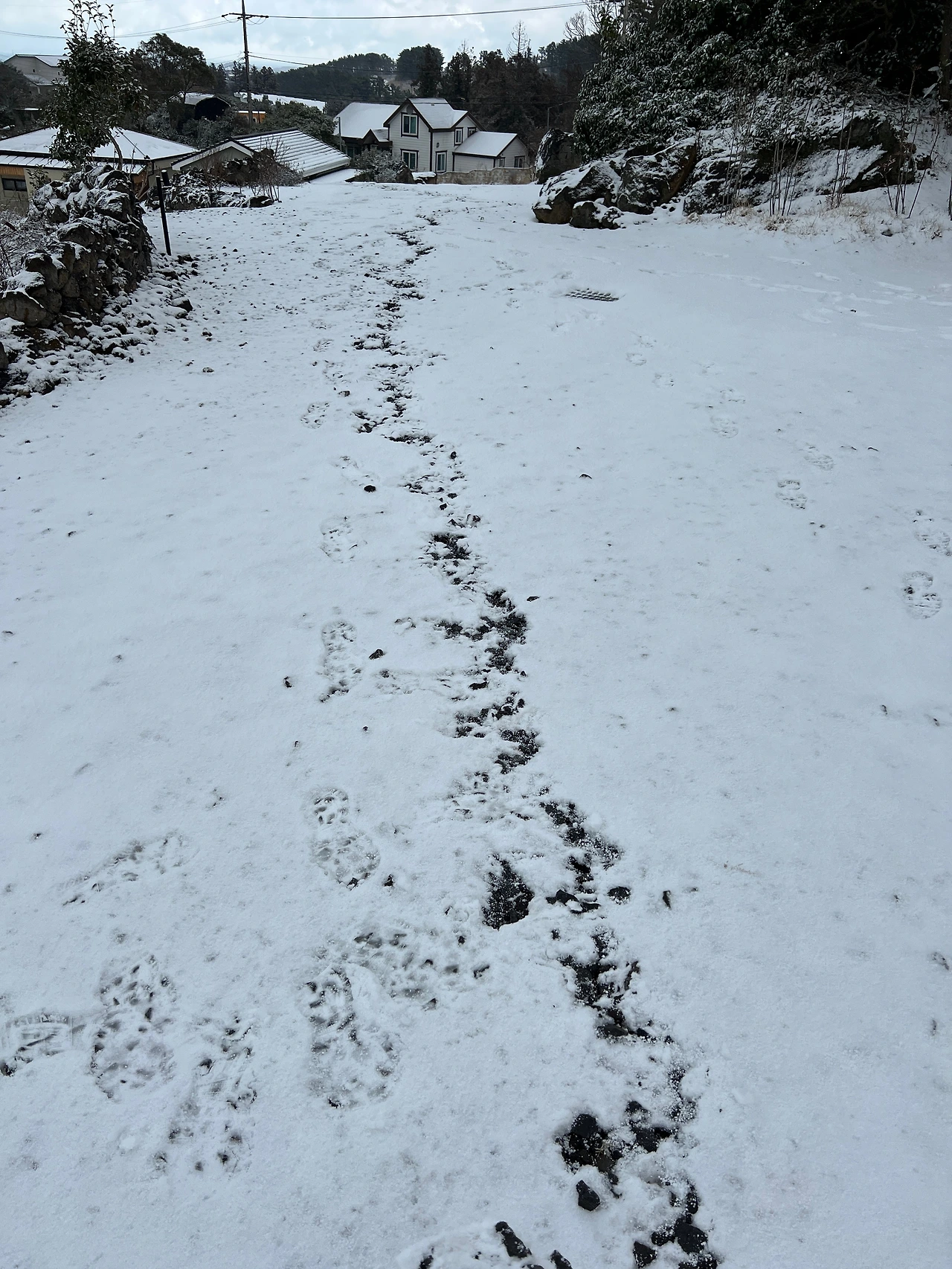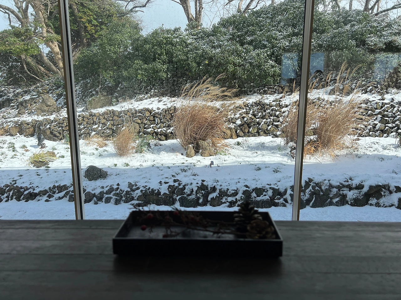 우리의 한달살이에, 아내의 친구 부부 두 팀이 함께 잠시 머물기로 하였고, 오늘은 그들이 제주도를 돌아보는 첫날이었다. 방학에 한달씩 내려올 수 있는 우리의 속 편한 처지와 달리 한쪽 부부는 휴가를 이틀 붙이는 것도 쉽지 않아 목요일 퇴근한 뒤 밤 비행기로 제주도에 왔고, 금요일인 오늘, 몇통의 업무 전화를 그는 받았다. 그들에게는 야속한 날씨이되 나에겐 마침내의 제주도의 설경이다. 12년 전 처음에 제주도를 와본 뒤에 진눈깨비며 싸리눈이며는 여러차례 구경해본 일이 있다만은 발이 푹푹 빠지는 눈은 처음이다. 하여 나는, 이것이 우리의 여행에도 나쁘지 않은 소식이라 생각했다. 물론 그 덕분에 배 역시 결항되어 하루를 버리긴 했지만서도 말이다.