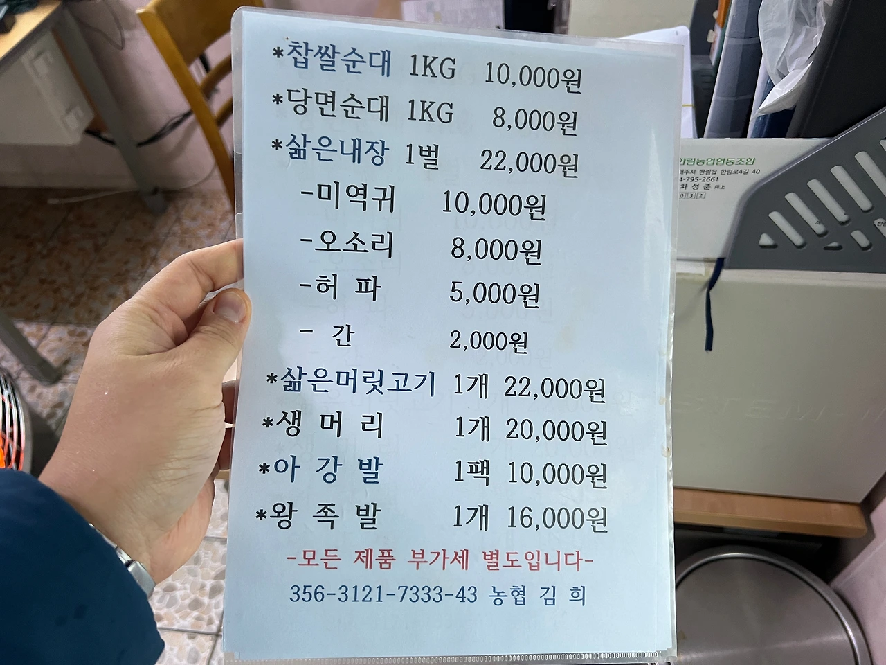 사무실 공간이다. 눈을 피해 얼른 문을 열고 들어가니 따듯하고 아늑한 작은 방이 나온다. 담당하시는 직원이 보이지 않아 구경을 하다가 메뉴판이 보여 구경을 했다. 1kg에 만원, 그리고...족발이 있다? 그리고 오소리감투에 허파와 간. 야 이거 제대로네.