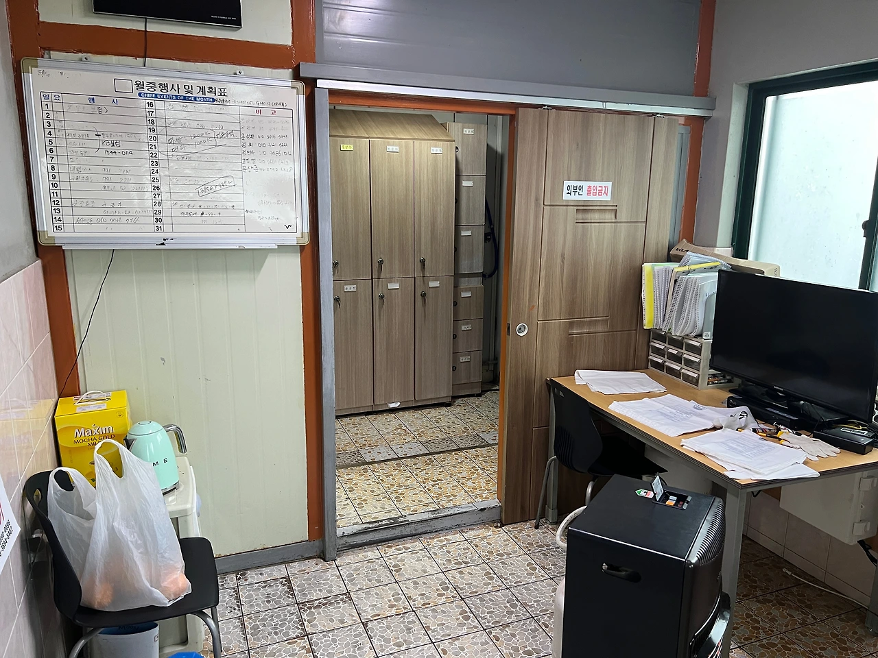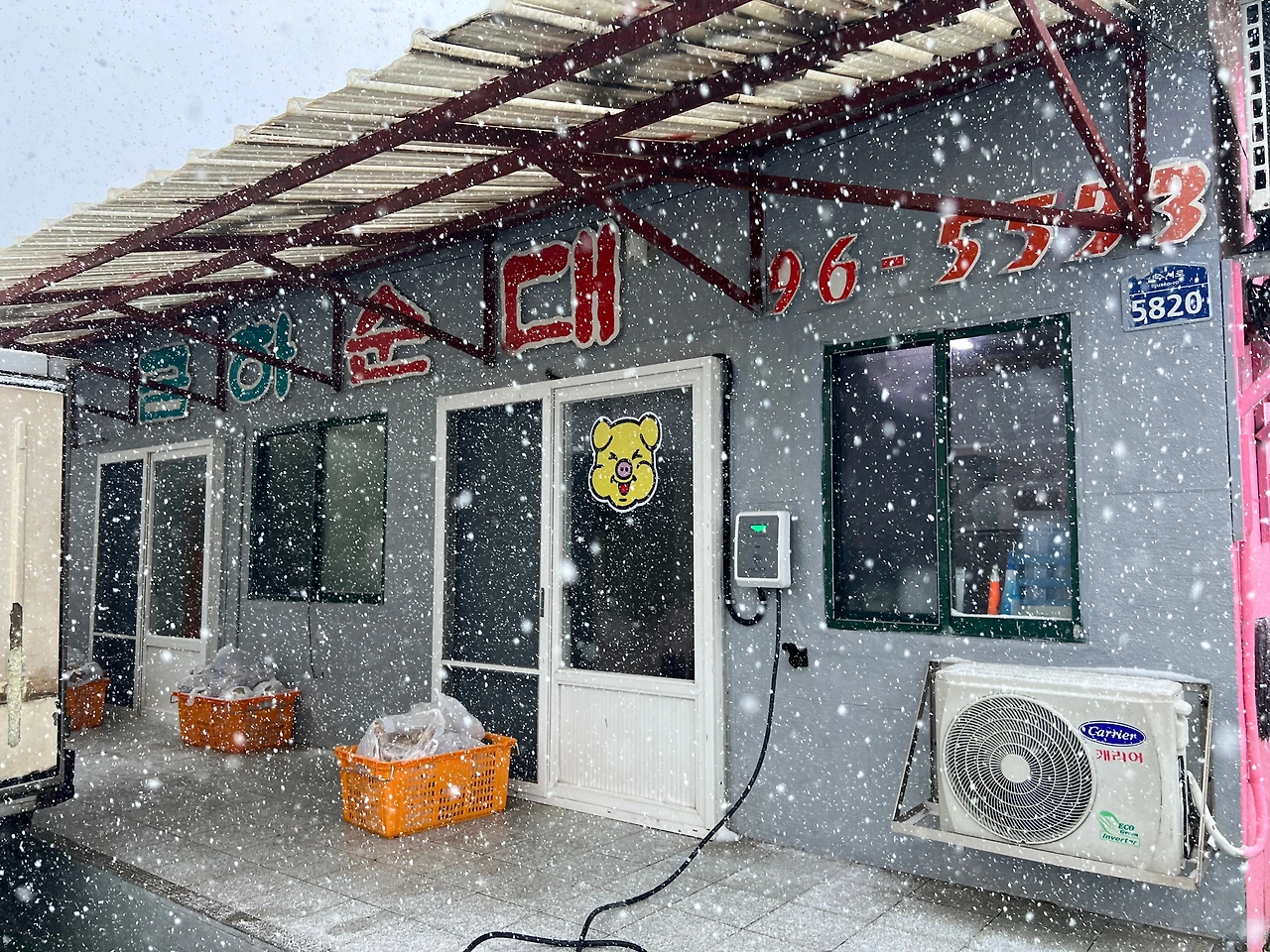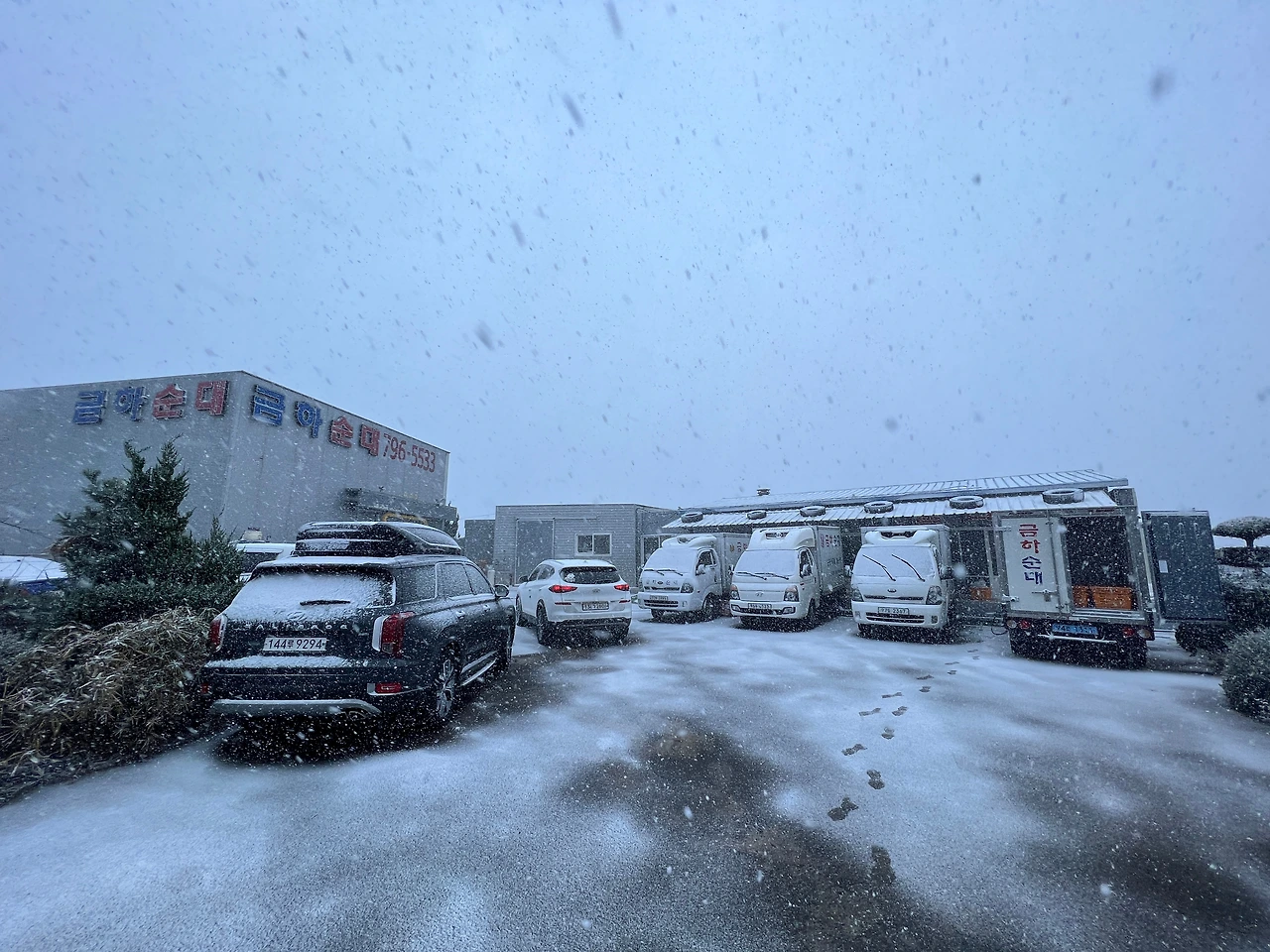 제주도 3일차까지 지독하게 폭설이었다. 그래서 10시 무렵 공장을 찾았을 때는 공장 앞에 늘어선 트럭들도 눈에 하얗게 뒤덮여있다. 눈발이 이렇게 생생히 찍힐 수 있는 강설량이라니. 그런데 그걸로 순대공장이나 찍고 있다니. 뭔가 설렘과 두려움이 교차하며 마침 공장 앞에서 노란색 버킷을 물청소 하고 있는 어르신이 보여, "순대 사러 왔는데요." 묻는다. 어르신께선 손으로 오른 편 끝을 가르키신다. 좋아. 소매가 가능하다더니 바로 살 수 있겠구나. 하고 문을 열고 들어간다.