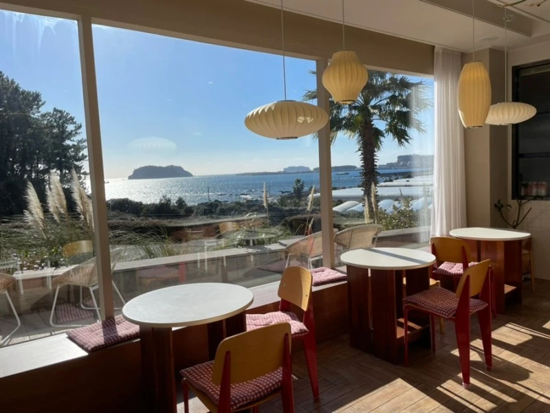 그러다보니, 분명히 지난번에 서귀포에 2주나 있었는데 왜 여길 못봤지? 한달살이를 네번째 하는 건데 그동안은 왜 여길 와 볼 생각을 못했지? 하는 그런 질문을 서로에게 던진다. 그러나 어리석은 질문으로, 당연하듯 수많은 식당과 카페가 없어지고 또 새로이 생겨나는 게 제주도만의 사정도 아닌 전국 어디서나 볼 수 있는 일. 우리가 왜 못 왔냐면, 그땐 그때대로 바삐 놀러다닌 때문이지. 시절인연이란 게 그리 쉽게 맺어지는 게 아냐. 객이 머물곳을 만나는 것도 다 인연인게다. 그런 인연이랄까, 아내의 친구 부부와 서귀포에 생긴 참으로 아름다운 카페에 왔다. 야 여기 정말 좋네. 저게 섭섬인가 밤섬인가 잘은 모르겠다만. 아 둘 다 사진에 찍힌 건가.