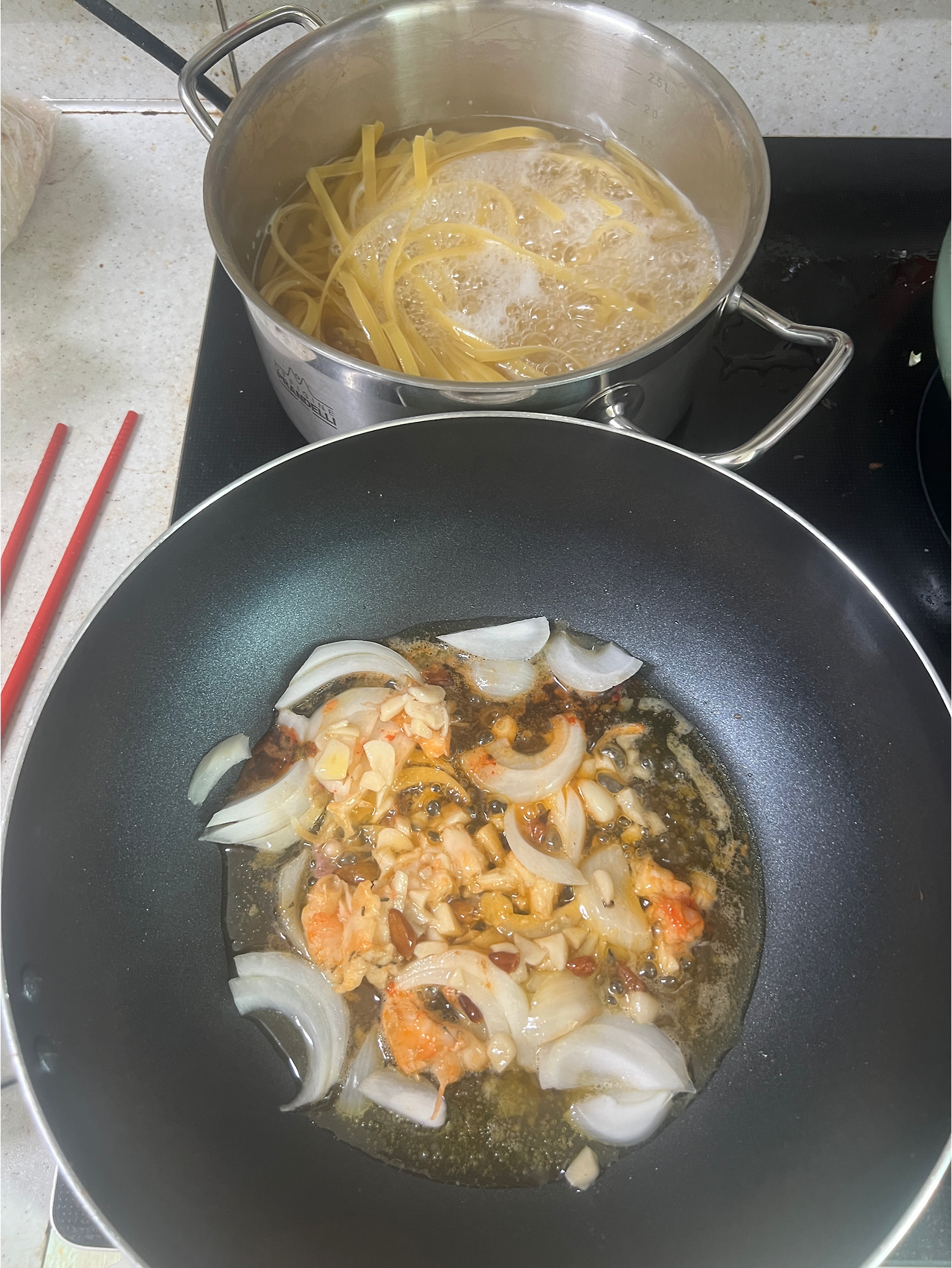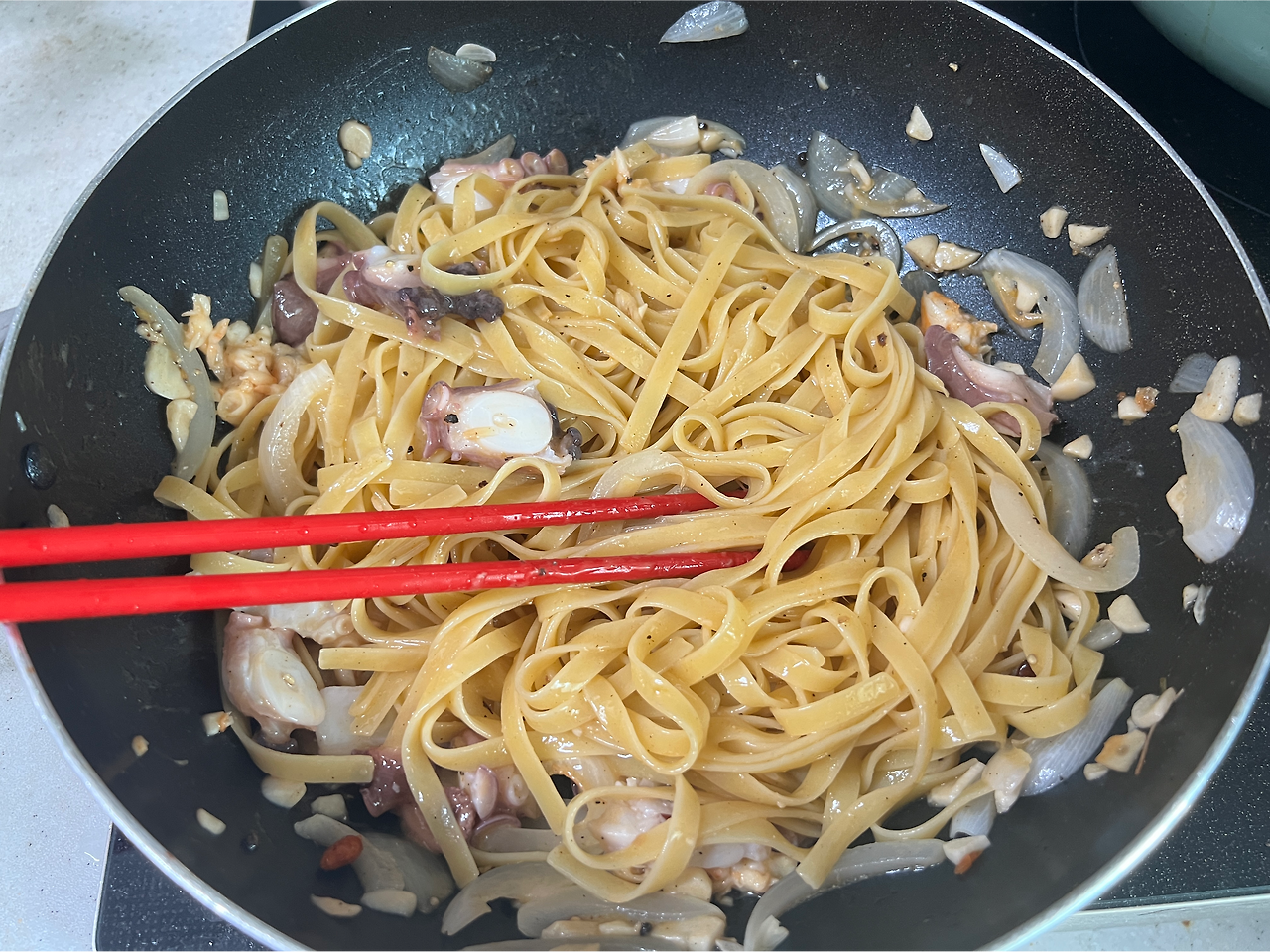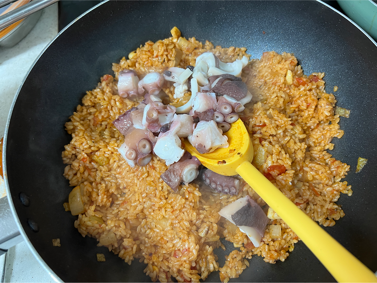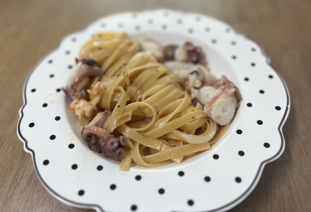 그리고 마지막 남은 문어는, 어제의 감바스 기름으로 파스타를 만든다. 감바스를 두배로 활용하는 방법.