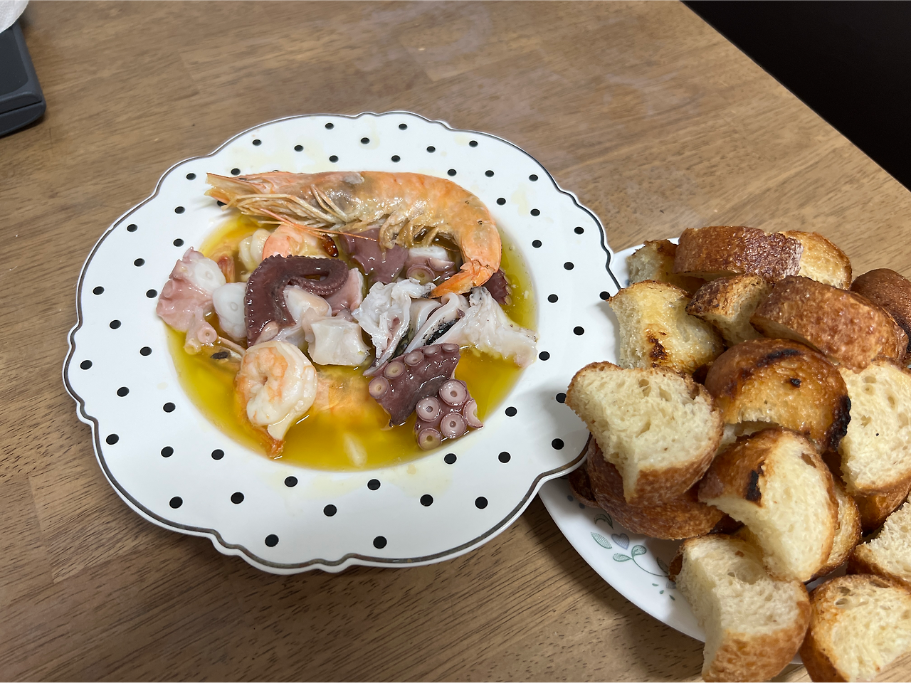 10분이면 감바스도 뚝딱이다. 칵테일새우와 흰다리새우를 약불에 보글보글 끓이는 사이 미리 빵집에서 한입 크기에 가깝도록 썰어달라고 한 바게트를 버터 약간에 구웠다. 문어는 감바스 냄비에 넣지 않았고, 먼저 접시에 감바스를 담은 뒤, 문어를 올리고, 냄비에 남은 감바스 기름을 한번 두르는 걸로 끝.
