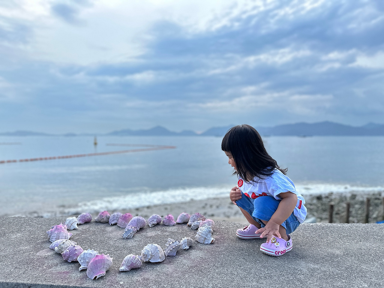 그래도, 눈치를 보는 만큼 눈치가 빨라, 이제는 왠만큼 아빠와 장난도 쳐준다. 산책 중에 예쁘게 소라를 배열한 곳이 있어 아이를 앞에 세웠다. 제방 위에 올리니 아이는 썩 좋아하지 않아서 처음엔 사진을 찍도록 허락해주지 않았다. 그러나 내가 춤을 추며 흥을 돋우자 아이도 같이 춤을 추어 준다. 춤을 추면 기분이 좋아진다는 걸 깨달았다고 할까. 아이가 알아서 먼저 몸을 움직일 때가 많다. 지금까지는 내가 아이의 율동에 맞추어주는 일은 없었는데, 예쁜 포토스팟을 찾았으니 아빠가 먼저 몸을 움직이며 춤을 제안한다. Shall we dance? 아이는 기분이 좋아지더니 이제 온갖 포즈를 잡아준다.