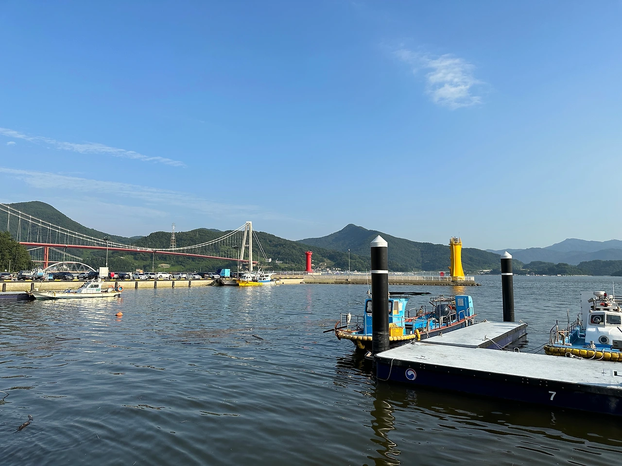 우리는 그렇게 또 무념무상으로, 큰 감흥도 없이, 적절하게 인증샷을 찍고 나왔다. 갓김치를 사서 갈까, 이런 말을 주고받다가 남해로 들어가는 길목에 있는 다른 카페를 하나 들렀다. 그런데 내 성미엔 이 카페의 뷰가 훨씬 좋았다. 남해에 들어가는 길목의 노량항은 작지만 깔끔하고 예쁜 항구다. 이 항구를 널리 조망하는 카페가 있는데, 가까이서 멀고 가까운 오밀조밀한 풍경을 모두 즐길 수 있다.