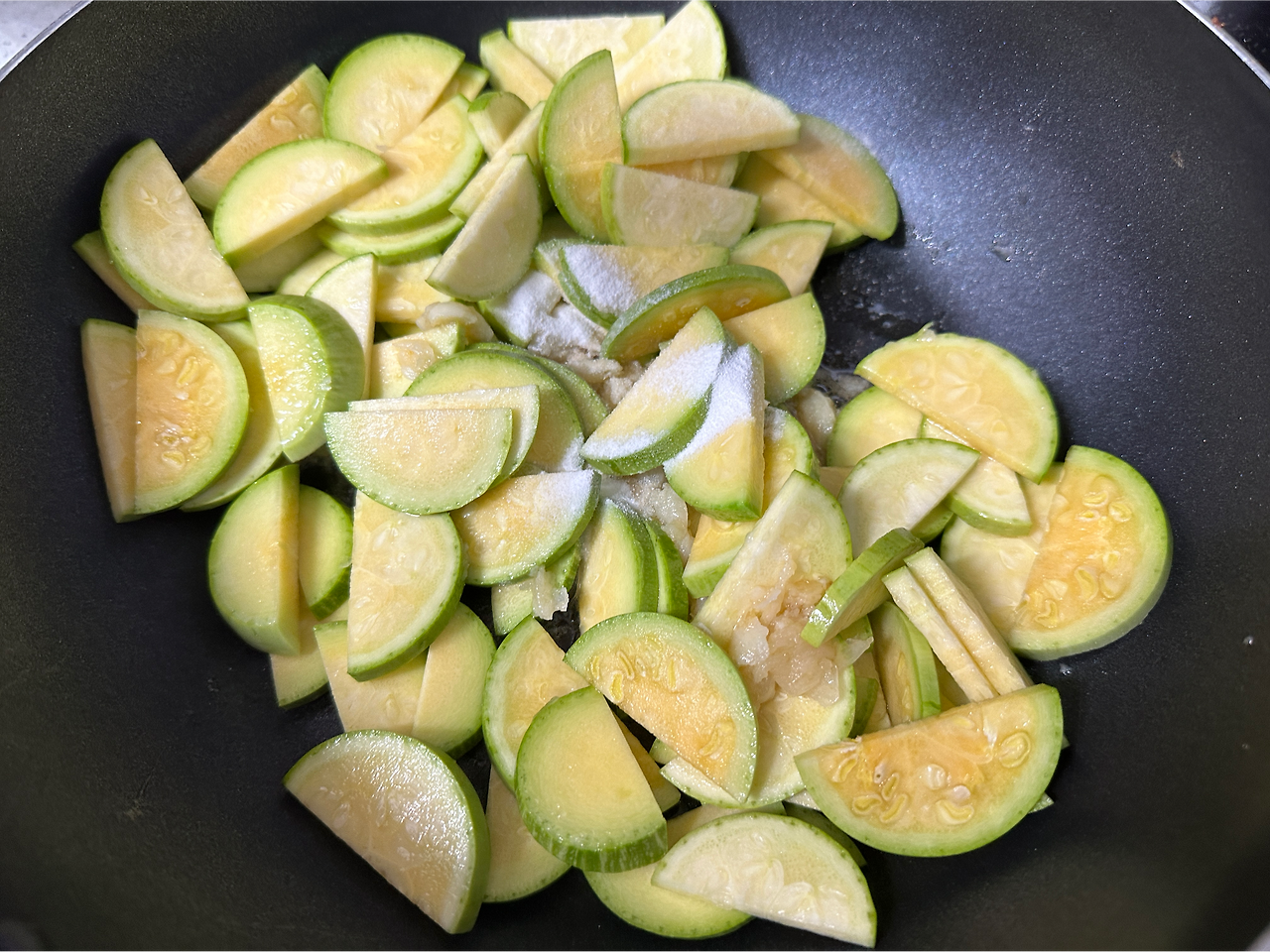 약불에 들기름을 가열하여 마늘향이 배이도록 하면서, 애호박 두개를 잘라서 팬에 넣었다. 그러자, 불쑥 옆에 와서 바깥양반이 묻는다.