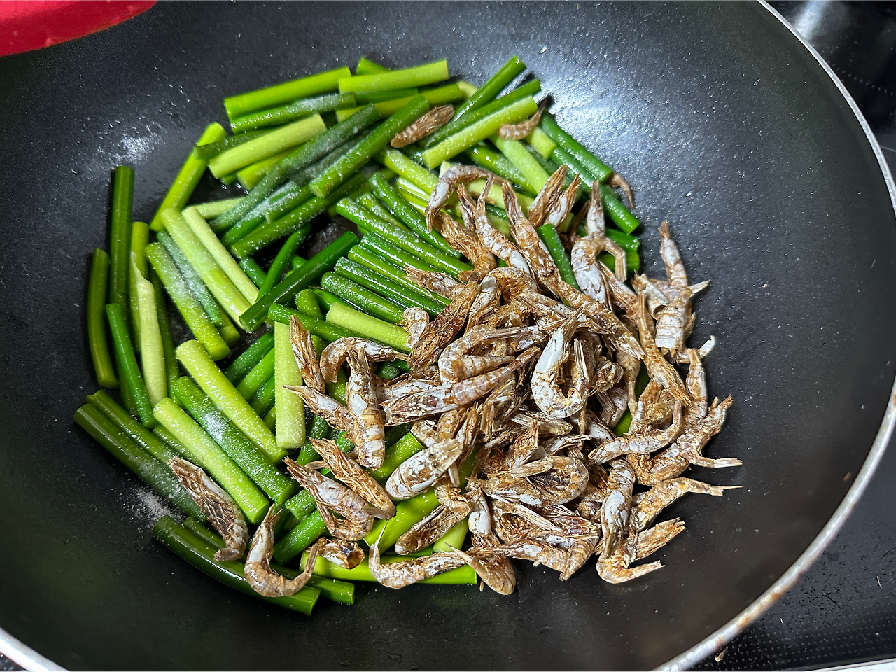 그래도 이 마늘쫑이 향이 아주 강한 것이 싱싱하고 좋다. 아쉬움은 아쉬움이고, 품질은 뭐. 한 입 먹어보니 입 안에 짜르르한 마늘의 매운 맛이 느껴진다. 쫑쫑 잘라서 소금과 볶는다. 그리고 미리 볶아둔 새우를 넣고, 본격적으로 볶는다.