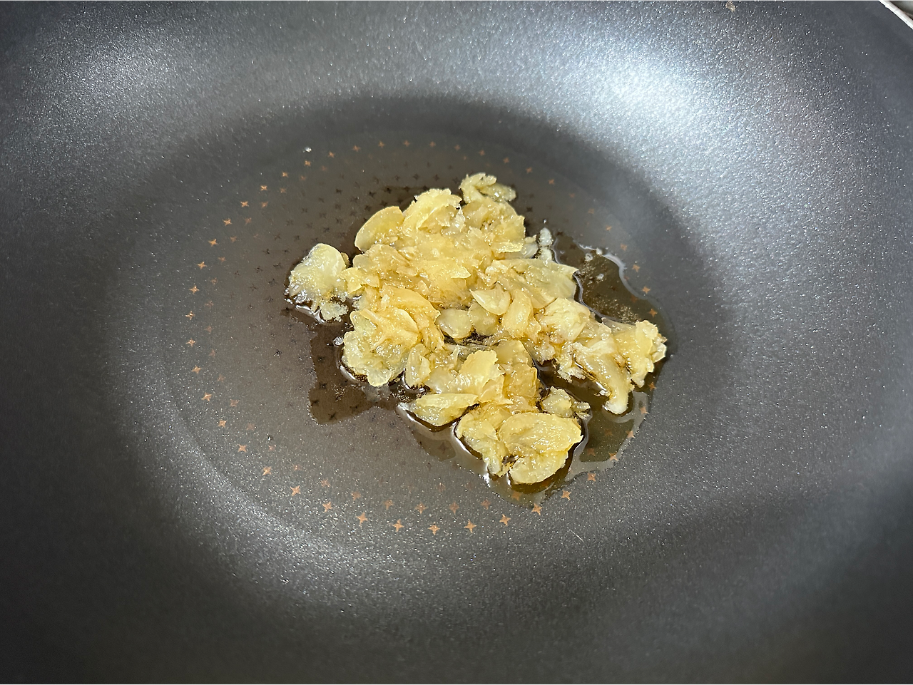 그릇에 넣기 전에 한 입. 크으 감칠맛, 바삭함. 얼른 그릇에 담고 팬을 한번 닦아낸다. 바쁘게, 마늘을 다지고 기름을- 음...호박새우볶음이므로, 들기름!