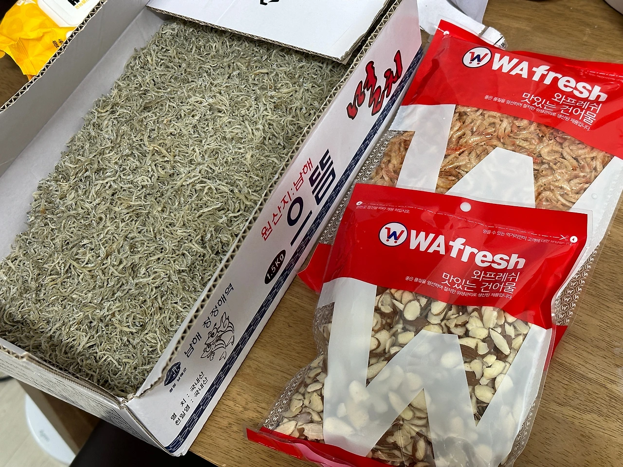 남해에서 멸치와 보리새우를 사 왔다. 한 박스에 4만원. 박스에 쓰여진대로 1.5kg보다는 묵직한데 얼마인지는 모르겠다. 미조항에서 식사를 한 뒤에 주변을 한바퀴 걷다가, 온 김에 남해 멸치로 반찬을 만들어주자는 생각에 나도 바깥양반도 동의했다.