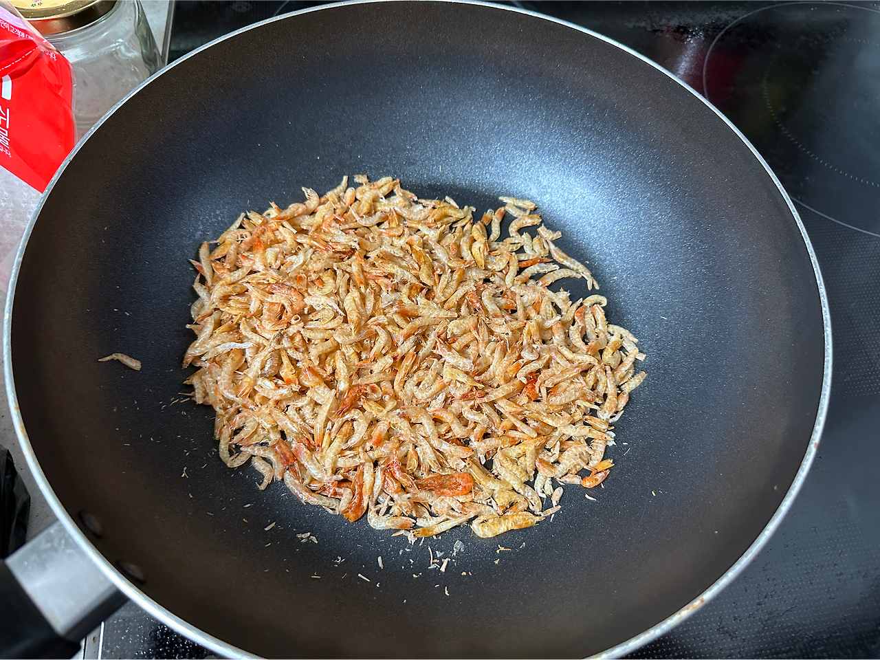 남은 보리새우 탁 털어서 다시 팬에서 볶는다. 기름 없이 볶으면서 잔여물과 노폐물 등을 슥슥 태우고 털어낸다. 건새우 자체가 풍미가 워낙 좋은 식재료인데, 이렇게 건조한 팬에 볶으면서 그 향은 거의 입안을 가득 채울 정도로 터져나온다. 볶다가 날라간 새우 한 조각을 입에만 넣어고 확, 하고.