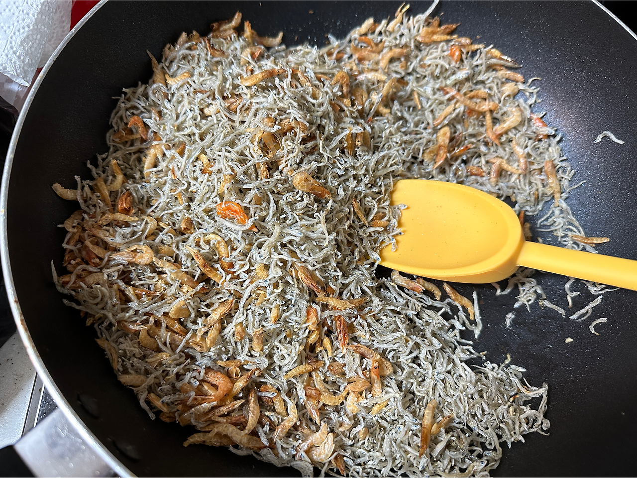 그리고 다시 팬을 헹군 뒤, 새우와 멸치를 한데 모아, 볶는다.