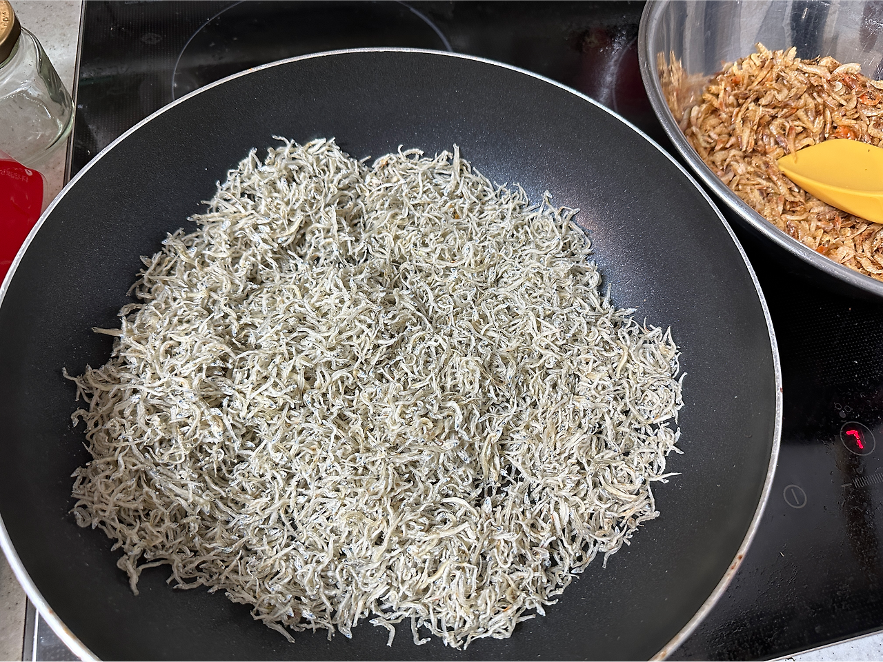 새우를 볼에 담고, 가루를 헹궈낸 뒤엔 이제 멸치 차례. 남해 멸치가 달고 고소한 맛이 난다. 짜지 않아서 더 좋다. 원래 이런 멸치는 올리고당에 흥건하게 적셔서 먹게 되지만, 나는 바삭하고 건조하게 만드는 것을 기본적으로 선호한다. 살짝 태우듯이 볶아서 식감을 살리고, 맛은 돋운다.