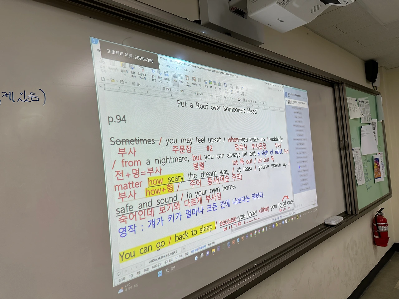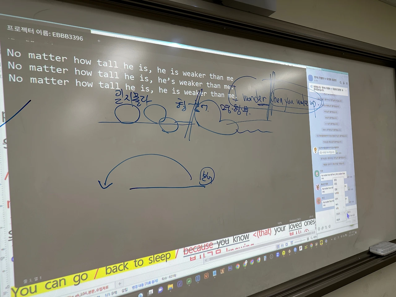 그러므로, 나는 아이들이 이 오픈채팅방을 1:1 개별화 질문에 활용할 수 있도록 하기 위해, 먼저 같이 이 채팅방을 써볼 수 있도록 했다. 카톡 창을 오른편에 띄워놓고, 화면 왼쪽에 선 내가 수업을 진행한다. 그리고 수업 중간에 샘플링이 가능한 문장이 나오면, 그 문장을 영작해볼 수 있도록 아이들에게 할당한다.