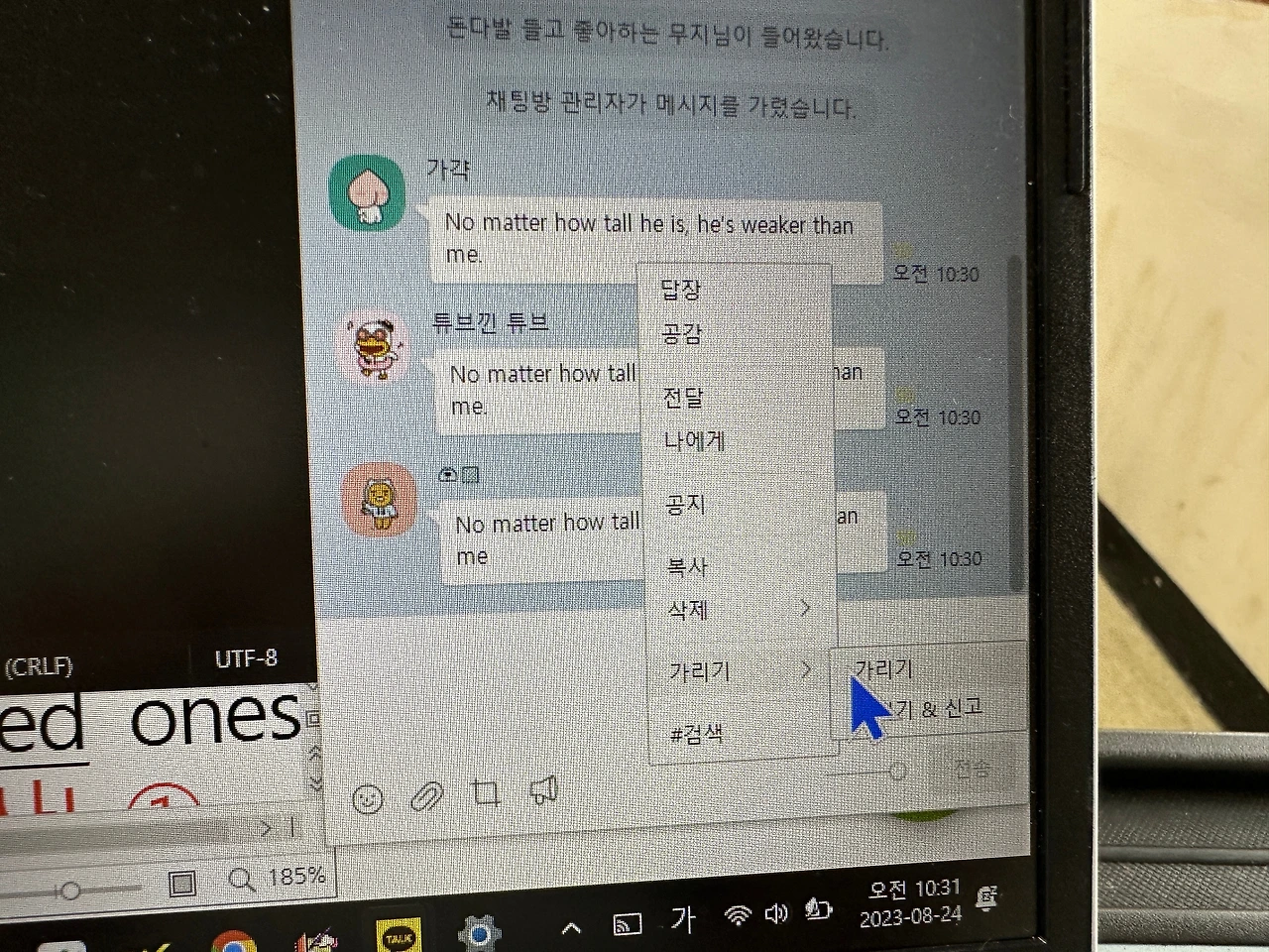 영작 활동이 끝난 뒤, 나는 일일이 아이들의 답변을 가리기 기능을 통해 채팅창에서 보이지 않도록 했다. 10개 학급에 반복해야 하므로 다른 학급의 영작 참여 내용은 불필요하다. 많은 아이들이 참여하면 나의 마우스 클릭질은 늘어난다. 그러나, 아이들과 대화하며 잠시의 클릭클릭으로, 다시 채팅창은 말끔해진다.