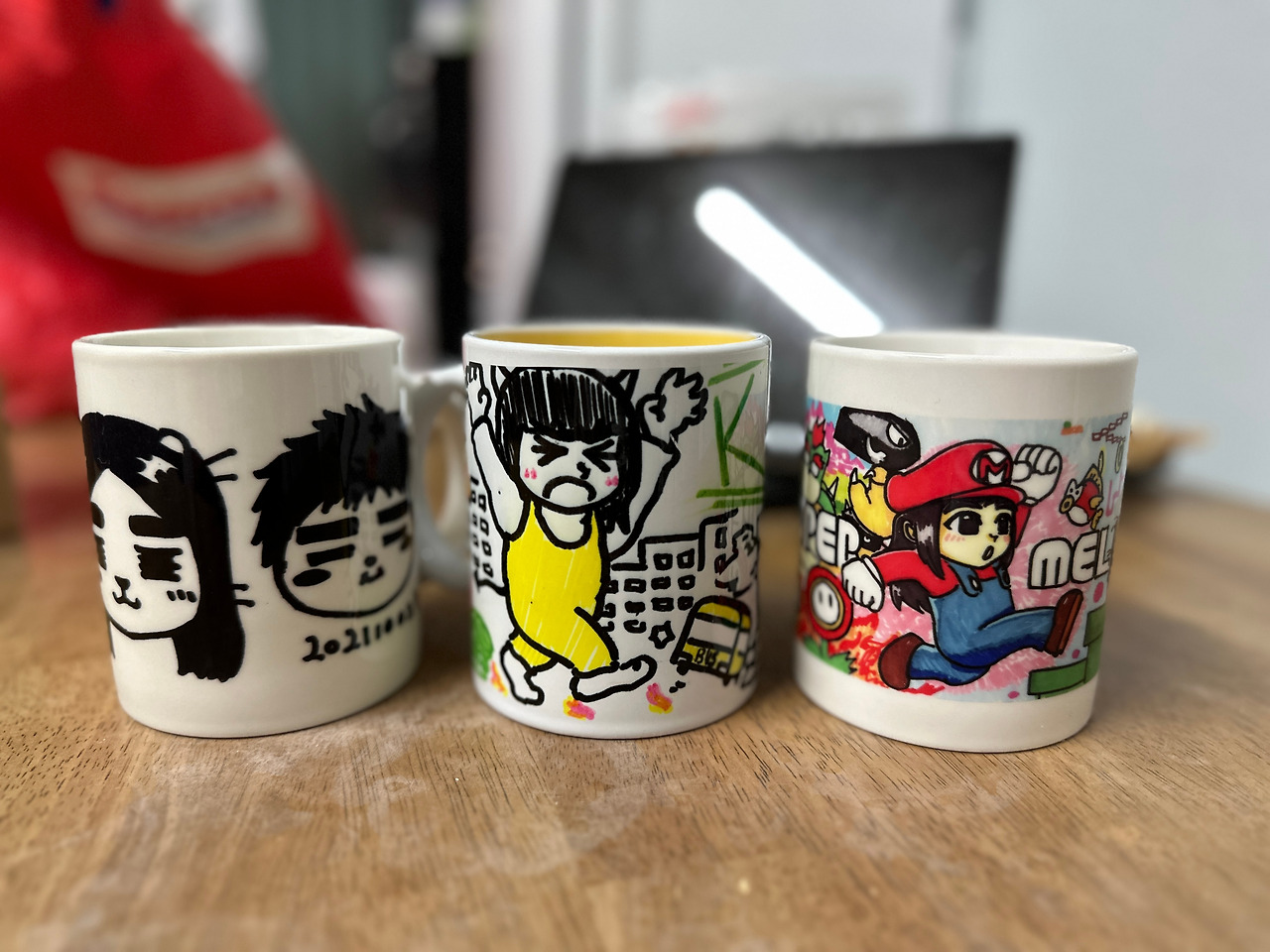 그러나 이번엔 조금 그나마 여유가 생기기도 했고, 키즈카페에서 기회가 생겨 제작한 머그컵을 집에서 잘 쓰고 있기 때문에, 한번, 제대로 그려보기로 했다. 오며 가며 학생들이 그린 머그컵 도안을 보고 자극을 받기도 했고 무엇보다도- 앞으론, 내가 그린 머그컵들로 집에서 주로 쓸 생각이다.