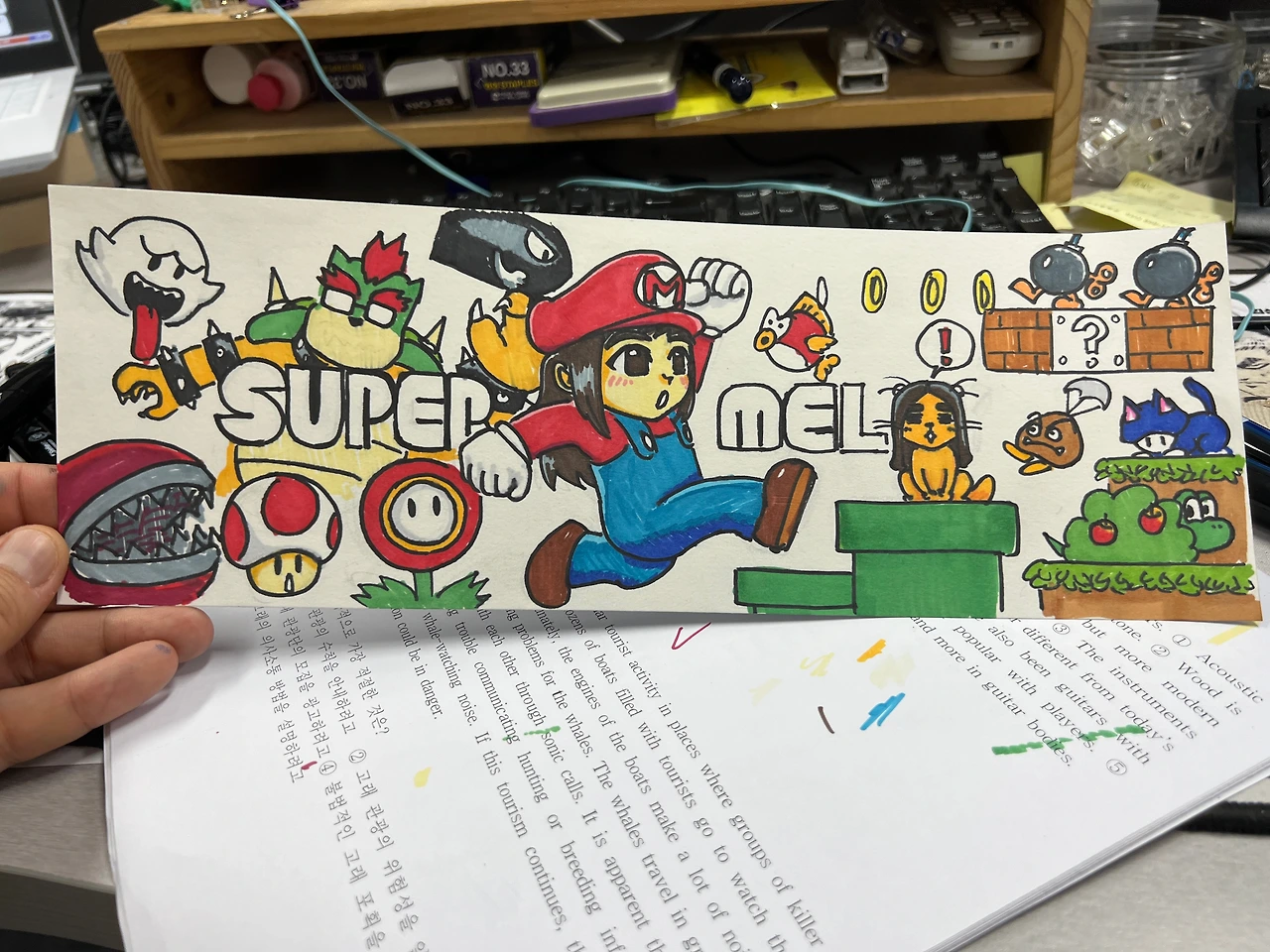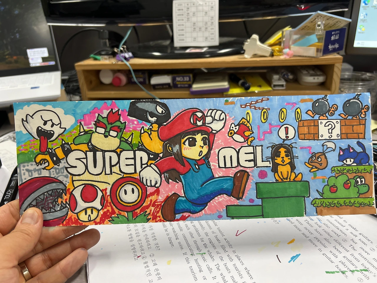 그렇게, 작업 시간 3일, 대강 총 4시간쯤만에 완성. 우리에게 나름 의미 있는 슈퍼마리오를 다시 차용했다. 특히나 힘들었던 건 슈퍼마리오의 폰트였다. 차라리 그냥 느낌 가는대로 슥슥 따라그리는 게 낫지, 비율과 각도를 신경써야 하는 폰트 그림은 손으로 할 일은 영 아니다.