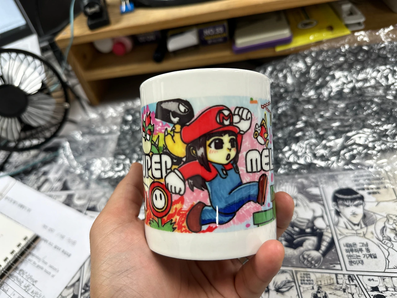 그리고 어제, 방학을 넘겨 대망의 컵이 도착했다. 미술 선생님이 센스있게 채도를 높이고 블러 처리까지 해, 괜-찮은 제품이 나왔다.